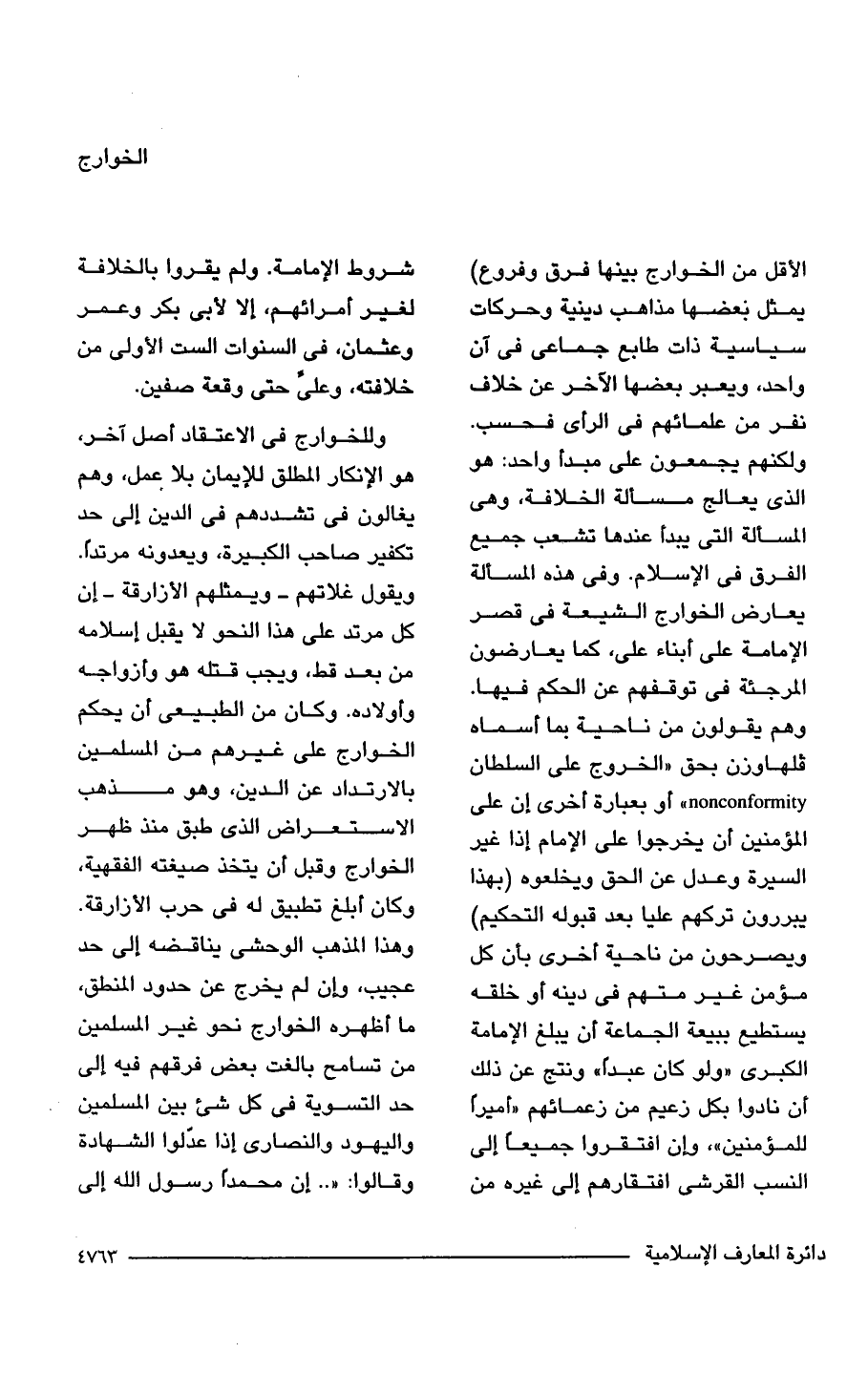 وللخوارج في الاعتقاد أصل آخر، هو الإنكار المطلق للإيمان بلا عمل، وهم يغالون في تشددهم في الدين إلى حد تكفير صاحب الكبيرة، ويعدونه مرتدًا. ويقول غلاتهم -ويمثلهم الأزارقة- إن كل مرتد على هذا النحو لا يقبل إسلامه من بعد قط، ويجب قتله هو وأزواجه وأولاده. وكان من الطبيعى أن يحكم الخوارج على غيرهم من المسلمين بالارتداد عن الدين، وهو مذهب الاستعراض الذي طبق منذ ظهر الخوارج وقبل أن يتخذ صيغته الفقهية، وكان أبلغ تطبيق له في حرب الأزارقة. وهذا المذهب الوحشى يناقضه إلى حد عجيب، وإن لم يخرج عن حدود المنطق، ما أظهره الخوارج نحو غير المسلمين من تسامح بالغت بعض فرقهم فيه إلى حد التسوية في كل شيء بين المسلمين واليهود والنصارى إذا عدلوا الشهادة وقالوا: ". . إن محمدًا رسول الله إلى