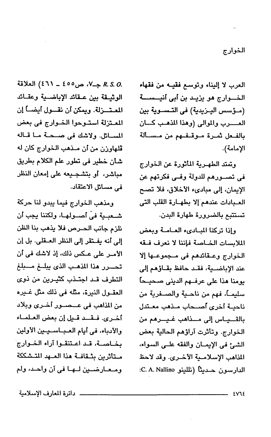 وإذا تركنا المبادئ العامة وبعض الملابسات الخاصة فإننا لا نعرف فقه الخوارج وعقائدهم في مجموعها إلا عند الإباضية، فقد حافظ بقاؤهم إلى يومنا هذا على عرفهم الديني صحيحا سليما، فهم من ناحية والصفرية من ناحية أخرى أصحاب مذهب معتدل بالقياس إلى مذاهب غيرهم من الخوارج، وتأثرت آراؤهم الحالية بعض الشيء في الإيمان والفقه على السواء، المذاهب الإِسلامية الأخرى. وقد لاحظ الدارسون حديثا (نللينو C. A. Nallino: R. S. O. جـ 7، ص 455 - 461) العلاقة الوثيقة بين عقائد الإباضية وعقائد المعتزلة. ويمكن أن نقول أيضًا إن المعتزلة استوحوا الخوارج في بعض المسائل. ولا شك في صحة ما قاله فلهاوزن من أن مذهب الخوارج كان له شأن خطير في تطور علم الكلام بطريق مباشر، أو بتشجيعه على إمعان النظر في مسائل الاعتقاد.