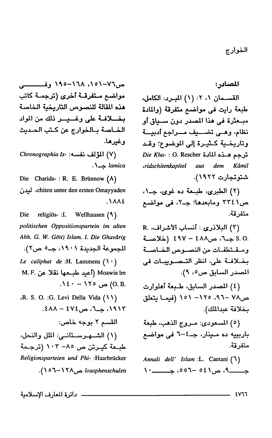 القسمان 1 , 2: (1) المبرد: الكامل، طبعة رايت في مواضع متفرقة (والمادة مبعثرة في هذا المصدر دون سياق أو نظام، وهي تضيف مراجع أدبية وتاريخية كثيرة إلى الموضوع؛ وقد ترجم هذه المادة Die Kha-: O. Rescher ridschitenkapitel aus dem Kamil, شتوتجارت 1922).