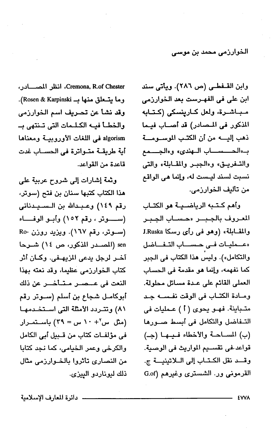 وابن القفطى (ص 286). ويأتي سند ابن علي في الفهرست بعد الخوارزمي مباشرة، ولعل كاربنسكى (كتابه المذكور في المصادر) قد أصاب فيما ذهب إليه من أن الكتب الموسومة بـ"الحساب الهندي" و"الجمع والتفريق" و"الجبر والمقابلة" والتي نسبت بسند ليست له، وإنما هي الواقع من تأليف الخوارزمي.
