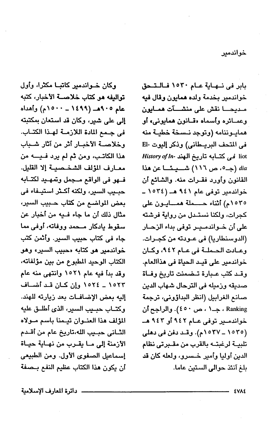 بابر في نهاية عام 1530 فالتحق خواندمير بخدمة ولده همايون وقال فيه مديحا نقش على منشآت همايون وعمائره واسماه "قانون همايونى" أو همايوننامه (وتوجد نسخة خطية منه في المتحف البريطاني) وذكر إليوت Elliot في كتابه تاريخ الهند History of India (جـ 5، ص 116) شيئا عن هذا القانون وأورد فقرات منه. والشائع أن خواندمير توفي عام 941 هـ (1534 - 1535 م) أثناء حملة همايون على كجرات، ولكنا نستدل من رواية فرشته على أن خواندمير توفي بداء الزحار (الدوسنطاريا) في عودته من كجرات. وعادت الحملة في عام 942, وكان خواندمير على قيد الحياة في هذا العام. وقد كتب عبارة تضمنت تاريخ وفاة صديقه وزميله في الترحال شهاب الدين صانع الغرابيل (انظر البداؤونى، ترجمة Ranking جـ 1، ص 450). والراجح أن خواندمير توفي عام 942 أو 943 هـ (1535 - 1537 م). وقد دفن في دهلي تلبية لرغبته بالقرب من مقبرتى نظام الدين أوليا وأمير خسرو، ولعله كان قد بلغ آنئذ حوالي الستين عاما.