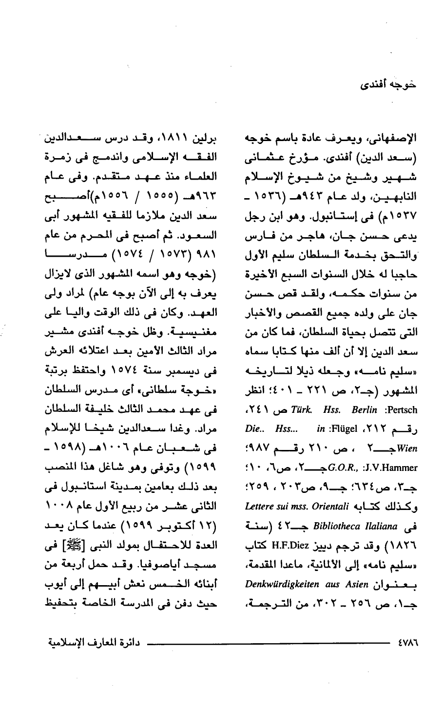 الإصفهاني، ويعرف عادة باسم خوجه (سعد الدين) أفندي. مؤرخ عثمانى شهير وشيخ من شيوخ الإِسلام النابهين، ولد عام 943 هـ (1536 - 1537 م) في إستانبول. وهو ابن رجل يدعى حسن جان، هاجر من فارس والتحق بخدمة السلطان سليم الأول حاجبا له خلال السنوات السبع الأخيرة من سنوات حكمه، ولقد قص حسن جان على ولده جميع القصص والأخبار التي تتصل بحياة السلطان، فما كان من سعد الدين إلا أن ألف منها كتابا سماه "سليم نامه" وجعله ذيلا لتاريخه المشهور (جـ 2، ص 221 - 401؛ انظر Turk Hss. Berlin: Pertsch ص 241, رقم 212, Die .. Hss ... in: Flugel Wien جـ 2، ص 210 رقم 987؛ G.O.R .. : J.V.Hammer جـ 2، ص 6، 10؛ جـ 3، ص 634؛ جـ 9، ص 203 , 259؛ وكذلك كتابه Lettere sui mss. Orientali في Bibliotheca Ilaliana جـ 42 (سنة 1826) وقد ترجم دييز H.F.Diez كتاب "سليم نامه" إلى الألمانية، ماعدا المقدمة، بعنوان Denkwiirdigkeiten aus Asien جـ 1، ص 256 - 302, من الترجمة, برلين 1811 , وقد درس سعد الدين الفقه الإِسلامي واندمج في زمرة العلماء منذ عهد متقدم. وفي عام 963 هـ (1555/ 1556 م) أصبح سعد الدين ملازما للفقيه المشهور أبي السعود. ثم أصبح في المحرم من عام 981 (1573/ 1574) مدرسا (خوجه وهو اسمه المشهور الذي لا يزال يعرف به إلى الآن بوجه عام) لمراد ولى العهد. وكان في ذلك الوقت واليا على مغنيسية. وظل خوجه أفندي مشير مراد الثالث الأمين بعد اعتلائه العرش في ديسمبر سنة 1574 واحتفظ برتبة "خوجة سلطاني" أي مدرس السلطان في عهد محمَّد الثالث خليفة السلطان مراد. وغدا سعد الدين شيخا للإسلام في شعبان عام 1006 هـ (1598 - 1599) وتوفي وهو شاغل هذا المنصب بعد ذلك بعامين بمدينة إستانبول في الثاني عشر من ربيع الأول عام 1008 (12 أكتوبر 1599) عندما كان يعد العدة للاحتفال بمولد النبي [- صلى الله عليه وسلم -] في مسجد أياصوفيا. وقد حمل أربعة من أبنائه الخمس نعش أبيهم إلى أيوب حيث دفن في المدرسة الخاصة بتحفيظ