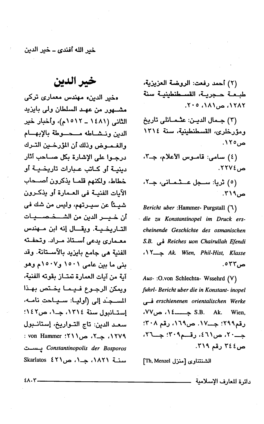 " خير الدين" مهندس معمارى تركى مشهور من عهد السلطان ولى بايزيد الثاني (1481 - 1512 م)، وأخبار خير الدين ونشاطه محوطة بالإبهام والغموض وذلك أن المؤرخين الترك درجوا على الإشارة بكل صاحب آثار دينية أو كاتب عبارات تاريخية أو خطاط، ولكنهم قلما يذكرون أصحاب الآيات الفنية في العمارة أو يذكرون شيئًا عن سيرتهم، وليس من شك في أن خير الدين من الشخصيات التاريخية. ويقال إنه ابن مهندس معمارى يدعى أستاذ مراد. وتحفته الفنية هي جامع بايزيد بالآستانة. وقد بنى ما بين عامي 1501 و 1507 م وهو آية من آيات العمارة تمتاز بقوته الفنية، ويمكن الرجوع فيما يختص بهذا المسجد إلى (أوليا: سياحت نامه، إستانبول سنة 1314, جـ 1، ص 142؛ سعد الدين: تاج التواريخ، إستانبول 1279, جـ 2، ص 211؛ von Hammer Constantinopolis der Bosporos بست سنة 1821, جـ 1، ص 421 Skarlatos