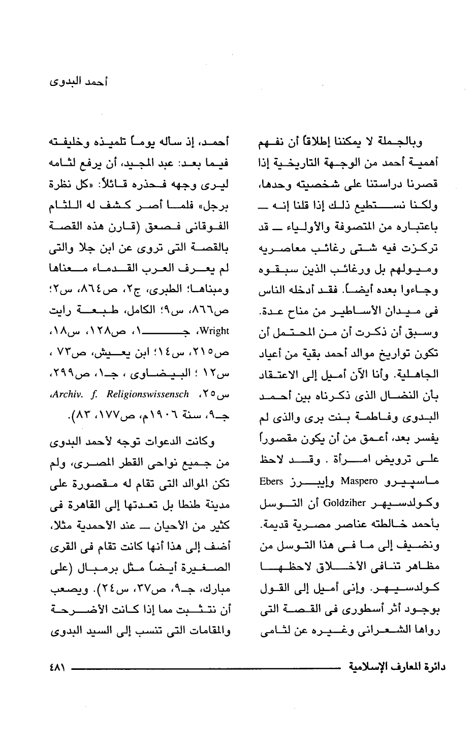 وبالجملة لا يمكننا إطلاقًا أن نفهم أهمية أحمد من الوجهة التاريخية إذا قصرنا دراستنا على شخصيته وحدها، ولكنا نستطيع ذلك إذا قلنا إنه -باعتباره من المتصوفة والأولياء- قد تركزت فيه شتى رغائب معاصريه وميولهم بل ورغائب الذين سبقوه وجاءوا بعده أيضًا. فقد أدخله الناس فى ميدان الأساطير من مناح عدة. وسبق أن ذكرت أن من المحتمل أن تكون تواريخ موالد أحمد بقية من أعياد الجاهلية. وأنا الآن أميل إلى الاعتقاد بأن النضال الذى ذكرناه بين أحمد البدوى وفاطمة بنت يرى والذى لم يفسر بعد، أعمق من أن يكون مقصورًا على ترويض امرأة. وقد لاحظ ماسبيروه Maspero وإيبرز Ebers وكولدسيهر Goldziher أن التوسل بأحمد خالطته عناصر مصرية قديمة. ونضيف إلى ما فى هذا التوسل من مظاهر تنافى الأخلاق لاحظها كولدسيهر. وإنى أميل إلى القول بوجود أثر أسطورى فى القصة التى رواها الشعرانى وغيره عن لثامى أحمد، إذ مسألة يومًا تلميذه وخليفته فيما بعد: عبد المجيد، أن يرفع لثامه ليرى وجهه فحذره قائلًا: "منظرة برجل" فلما أصر كشف له اللثام الفوقانى فصعق (قارن هذه القصة بالقصة التى تروى عن ابن جلا والتي لم يعرف العرب القدماء معناها ومبناها؛ الطبرى، ج 2، ص 864، س 2؛ ص 866، س 9؛ الكامل، طبعة رايت Wright، جـ 1، ص 128، س 18، ص 215، س 14؛ ابن يعيش، ص 73، س 12؛ البيضاوى، جـ 1، ص 299، س 25, Archiv. F. Religionswissensch, جـ 9، سنة 1906 م، ص 83، 177). وكانت الدعوات توجه لأحمد البدوى من جميع نواحى القطر المصرى، ولم تكن الموالد التى تقام له مقصورة على مدينة طنطا بل تعدتها إلى القاهرة فى كثير من الأحيان -عند الأحمدية مثلا، أضف إلى هذا أنها كانت تقام فى القرى الصغيرة أيضًا مثل برمبال (على مبارك، جـ 9، ص 37، س 24). ويصعب أن نتثبت مما إذا كانت الأضرحة والمقامات التى تنسب إلى السيد البدوى