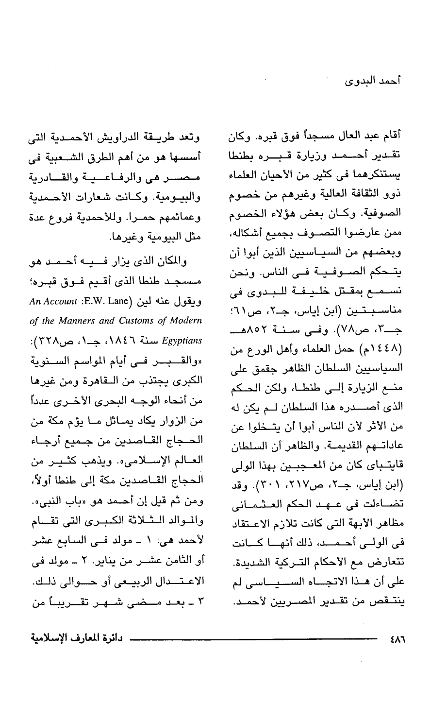 أقام عبد العال مسجدًا فوق قبره. وكان تقدير أحمد وزيارة قبره بطنطا يستنكرهما فى كثير من الأحيان العلماء ذوو الثقافة العالية وغيرهم من خصوم الصوفية. وكان بعض هؤلاء الخصوم ممن عارضوا التصوف بجميع أشكاله، وبعضهم من السياسيين الذين أبوا أن يتحكم الصوفية فى الناس. ونحن نسمع بمقتل خليفة للبدوى فى مناسبتين (ابن إياس، جـ 2، ص 61؛ جـ 3، ص 78). وفى سنة 852 هـ (1448 م) حمل العلماء وأهل الورع من السياسيين السلطان الظاهر جقمق على منع الزيارة إلى طنطا, ولكن الحكم الذى أصدره هذا السلطان لم يكن له من الأثر لأن الناس أبوا أن يتخلوا عن عاداتهم القديمة. والظاهر أن السلطان قايتباى كان من المعجبين بهذا الولى (ابن إياس، جـ 2، ص 217، 301). وقد تضاءلت فى عهد الحكم العثمانى مظاهر الأبهة التى كانت تلازم الاعتقاد فى الولى أحمد، ذلك أنها كانت تتعارض مع الأحكام التركية الشديدة. على أن هذا الاتجاه السياسى لم ينتقص من تقدير المصريين لأحمد. وتعد طريقة الدراويش الأحمدية التى أسسها هو من أهم الطرق الشعبية فى مصر هي والرفاعية والقادرية والبيومية. وكانت شعارات الأحمدية وعمائمهم حمرا. وللأحمدية فروع عدة مثل البيومية وغيرها.