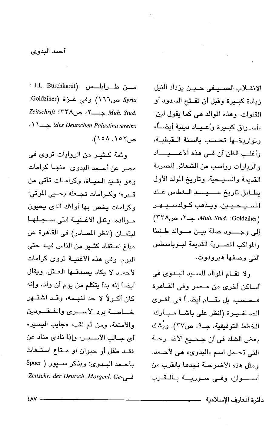 ولا تقام الموالد للسيد البدوى فى أماكن أخرى من مصر وفى القاهرة فحسب، بل تقام أيضًا فى القرى الصغيرة (انظر على باشا مبارك: الخطط التوفيقية، جـ 9، ص 37). ويُشك بعض الشك فى أن جميع الأضرحة التى تحمل اسم "البدوى" هي لأحمد. ومثل هذه الأضرحة نجدها بالقرب من أسوان، وفى سورية بالقرب من طرابلس (J.L. Burchkardt: Syria ص 166) وفى غزة (Goldziher: Muh. Stud. جـ 2، ص 338؛ Zeitschrift des Deutschen Palastinavereins؛ جـ 11، ص 152, 158).