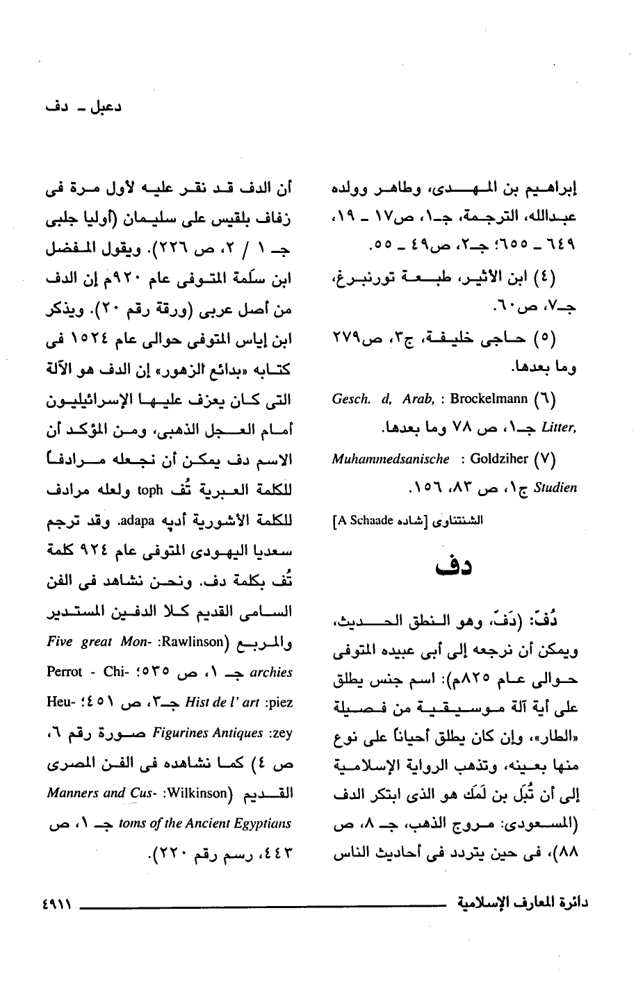 دُفّ: (دَفّ، وهو النطق الحديث، ويمكن أن نرجعه إلى أبي عبيدة المتوفى حوالي عام 825 م): اسم جنس يطلق على أية آلة موسيقية من فصيلة "الطار"، وإن كان يطلق أحيانًا على نوع منها بعينه، وتذهب الرواية الإِسلامية إلى أن تُبَل بن لَمَك هو الذي ابتكر الدف (المسعودي: مروج الذهب، جـ 8، ص 88)، في حين يتردد في أحاديث النَّاس أن الدف قد نقر عليه لأول مرة في زفاف بلقيس على سليمان (أوليا جلبى جـ 1/ 2، ص 226). ويقول المفضل ابن سلمة المتوفى عام 920 م إن الدف من أصل عربي (ورقة رقم 20). ويذكر ابن إياس المتوفى حوالي عام 1524 في كتابه "بدائع الزهور" إن الدف هو الآلة التي كان يعزف عليها الإسرائيليون أمام العجل الذهبى، ومن المؤكد أن الاسم دف يمكن أن نجعله مرادفًا للكلمة العبرية تُف toph ولعله مرادف للكلمة الأشورية أدبه adapa . وقد ترجم سعديا اليهودي المتوفى عام 924 كلمة تُف بكلمة دف. ونحن نشاهد في الفن السامى القديم كلا الدفين المستدير والمربع (: Rawlinson Five great Monarchies جـ 1، ص 535؛ Perrot - Chi Hist de l' art: piez جـ 3، ص 451؛ HeuFigurines Antiques: zey صورة رقم 6، ص 4) كما نشاهده في الفن المصرى القديم (: Wilkinson Manners and Customs of the Ancient Egyptians جـ 1، ص 443, رقم 220).