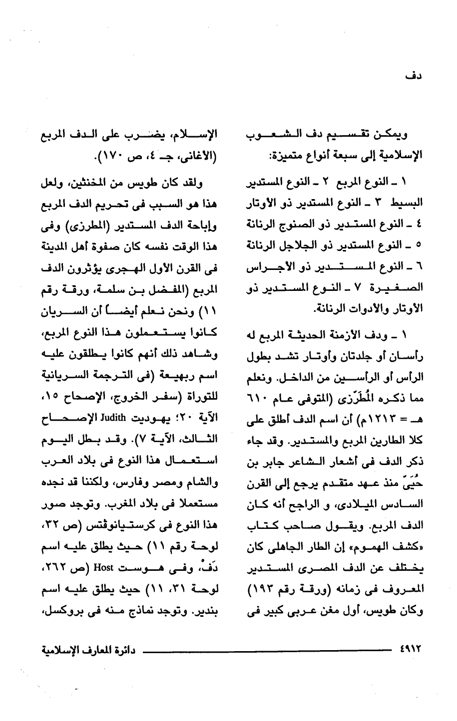 ولقد كان طويس من المخنثين، ولعل هذا هو السبب في تحريم الدف المربع وإباحة الدف المستدير (المطرزى) وفي هذا الوقت نفسه كان صفوة أهل المدينة في القرن الأول الهجري يؤثرون الدف المربع (المفضل بن سلمة، ورقة رقم 11) ونحن نعلم أَيضًا أن السريان كانوا يستعملون هذا النوع المربع، وشاهد ذلك أنَّهم كانوا يطلقون عليه اسم ربهيعة (في الترجمة السريانية للتوراة (سفر الخروج، الإصحاح 15، الآية 20؛ يهوديت Judith الإصحاح الثالث، الآية 7). وقد بطل اليوم استعمال هذا النوع في بلاد العرب والشَّام ومصر وفارس، ولكننا قد نجده مستعملا في بلاد المغرب. وتوجد صور هذا النوع في كرستيانوفتس (ص 32، لوحة رقم 11) حيث يطلق عليه اسم دَفْ، وفي هوست Host (ص 262, لوحة 31, 11) حيث يطلق عليه اسم بندير. وتوجد نماذج منه في بروكسل،