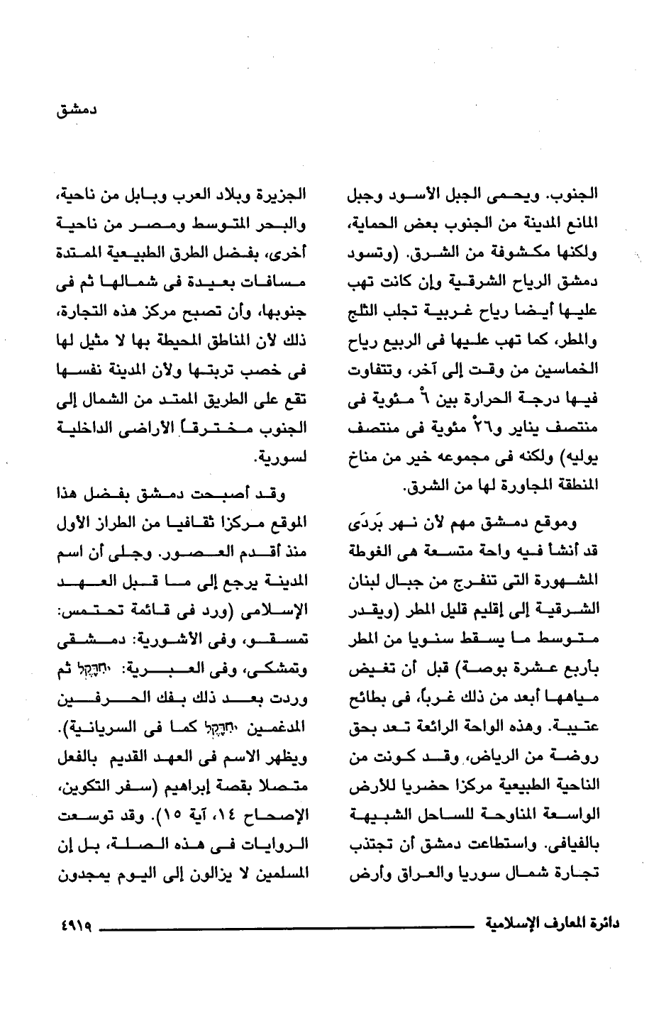 الجنوب. ويحمى الجبل الأسود وجبل المانع المدينة من الجنوب بعض الحماية، ولكنها مكشوفة من الشرق. (وتسود دمشق الرياح الشَّرقية وإن كانت تهب عليها أَيضًا رياح غربية تجلب الثلج والمطر، كما تهب عليها في الرَّبيع رياح الخماسين من وقت إلى آخر، وتتفاوت فيها درجة الحرارة بين 6 ْ مئوية في منتصف يناير و 26 ْ مئوية في منتصف يوليه) ولكنه في مجموعة خير من مناخ المنطقة المجاورة لها من الشرق.