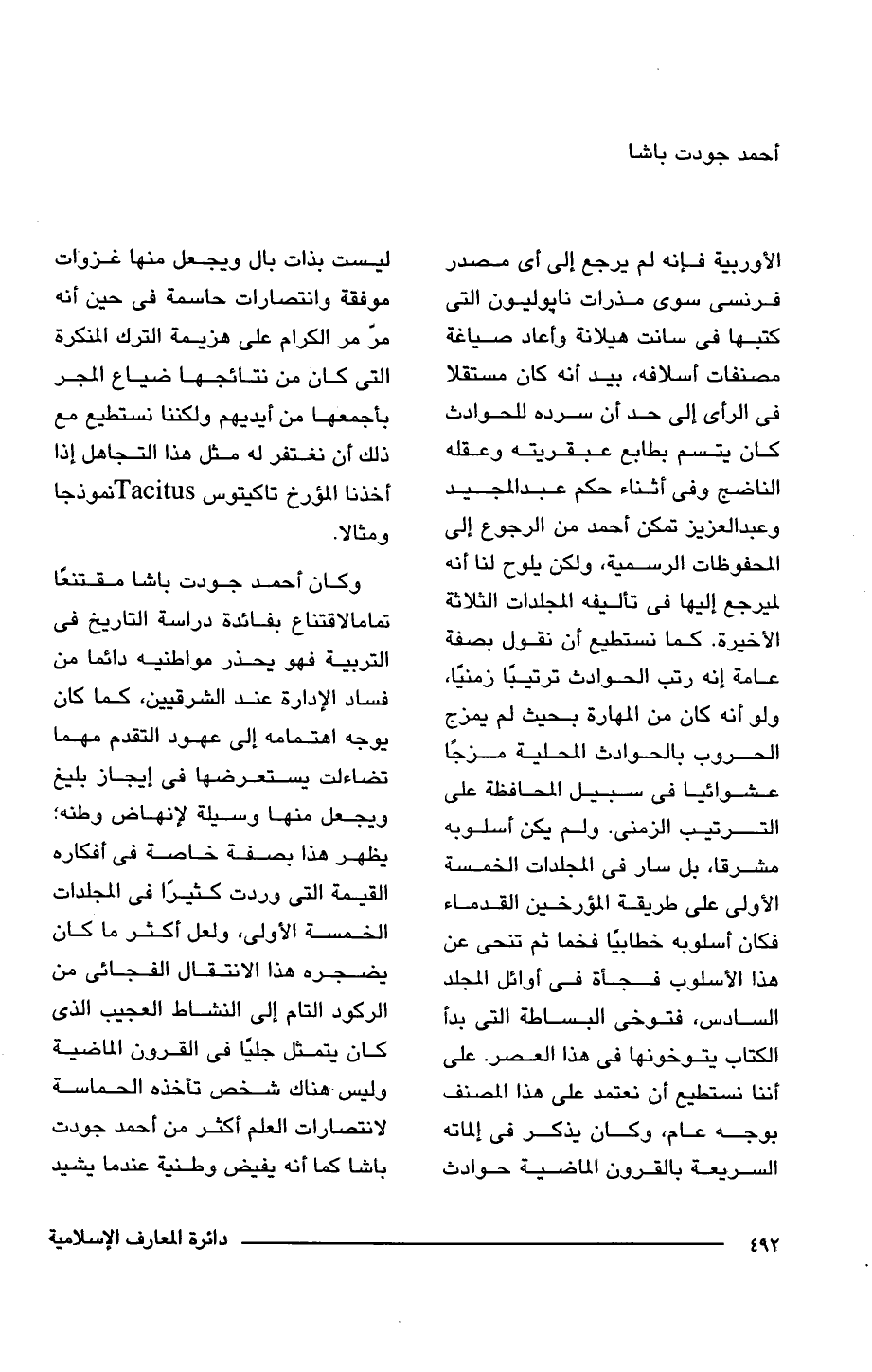 الأوربية فإنه لم يرجع إلى أى مصدر فرنسى سوى مذرات نابوليون التى كتبها فى سانت هيلانة وأعاد صياغة مصنفات أسلافه، بيد أنه كان مستقلا فى الرأى إلى حد أن سرده للحوادث كان يتسم بطابع عبقريته وعقله الناضج وفى أثناء حكم عبد المجيد وعبد العزيز تمكن أحمد من الرجوع إلى المحفوظات الرسمية، ولكن يلوح لنا أنه لم يرجع إليها فى تأليفه المجلدات الثلاثة الأخيرة. كما نستطيع أن نقول بصفة عامة إنه رتب الحوادث ترتيبًا زمنيًا، ولو أنه كان من المهارة بحيث لم يمزج الحروب بالحوادت المحلية مزجًا عشوائيا فى سبيل المحافظة على الترتيب الزمنى. ولم يكن أسلوبه مشرقا، بل سار فى المجلدات الخمسة الأولى على طريقة المؤرخين القدماء فكان أسلوبه خطابيًا فخما ثم تنحى عن هذأ الأسلوب فجأة فى أوائل المجلد السادس، فتوخى البساطة التى بدأ الكتاب يتوخونها فى هذا العصر. على أننا نستطيع أن نعتمد على هذا المصنف بوجه عام، وكان يذكر فى إلماته السريعة بالقرون الماضية حوادث ليست بذات بال ويجعل منها غزوات موفقة وانتصارات حاسمة فى حين أنه مرّ مر الكرام على هزيمة الترك المنكرة التى كان من نتائجها ضياع المجر بأجمعها من أيديهم ولكننا نستطيع مع ذلك أن نغتفر له مثل هذا التجاهل إذا أخذنا المؤرخ تاكيتوس Tacitus نموذجا ومثالا.