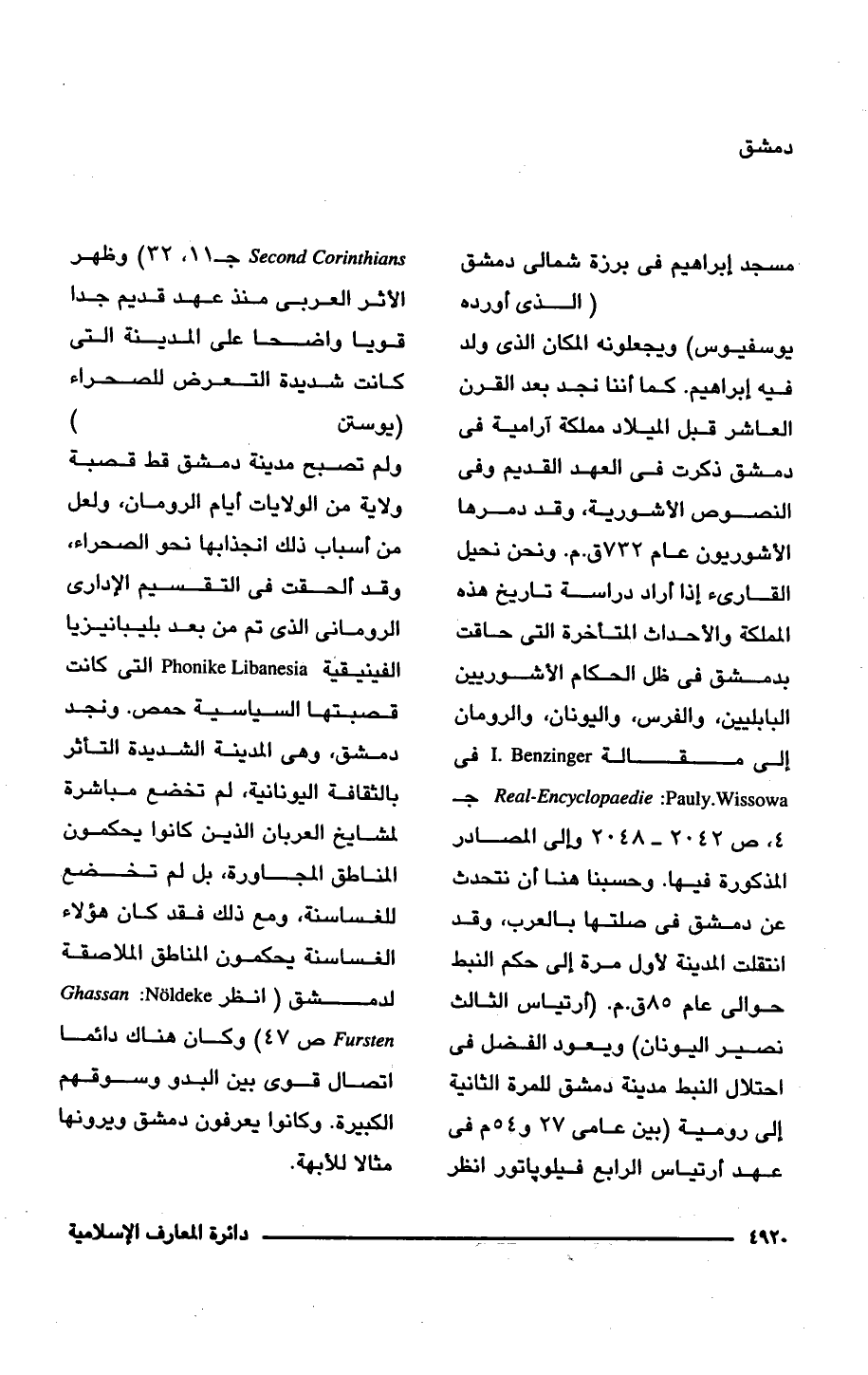 مسجد إبراهيم في برزة شمالي دمشق (الذي أورده يوسفيوس) ويجعلونه المكان الذي ولد فيه إبراهيم. كما أننا نجد بعد القرن العاشر قبل الميلاد مملكة آرامية في دمشق ذكرت في العهد القديم وفي النصوص الأشورية, وقد دمرها الأشوريون عام 732 ق. م. ونحن نحيل القارئ إذا أراد دراسة تاريخ هذه المملكة والأحداث المتأخرة التي حاقت بدمشق في ظل الحكام الأشوريين البابليين، والفرس، واليونان، والرومان إلى مقالة I. Benzinger في Real-Encyclopaedie: Pauly.Wissowa جـ 4، ص 2042 - 2048 إلى المصادر المذكورة فيها. وحسبنا هنا أن نتحدث عن دمشق في صلتها بالعرب، وقد انتقلت المدينة لأول مرة إلى حكم النبط حوالي عام 85 ق. م. (أرتياس الثالث نصير اليونان) ويعود الفضل في احتلال النبط مدينة دمشق للمرة الثَّانية إلى رومية (بين عامي 27 و 54 م في عهد أرتياس الرابع فيلوباتور انظر Second Corinthians جـ 11 , 32) وظهر الأثر العربي منذ عهد قديم جدًا قويا واضحا على المدينة التي كانت شديدة التعرض للصحراء (يوستن) ولم تصبح مدينة دمشق قط قصبة ولاية من الولايات أيام الرومان، ولعل من أسباب ذلك انجذابها نحو الصحراء، وقد ألحقت في التقسيم الإدارى الرومانى الذي تم من بعد بليبانيزيا الفينيقية Phonike Libanesia التي كانت قصبتها السياسية حمص. ونجد دمشق، وهي المدينة الشديدة التأثر بالثقافة اليونانية، لم تخضع مباشرة لمشايخ العربان الذين كانوا يحكمون المناطق المجاورة، بل لم تخضع للغساسنة، ومع ذلك فقد كان هؤلاء الغساسنة يحكمون المناطق الملاصقة لدمشق (انظر Noldeke: Ghassan Fursten ص 47) وكان هناك دائمًا اتصال قوى بين البدو وسوقهم الكبيرة. وكانوا يعرفون دمشق ويرونها مثالا للأبهة.
