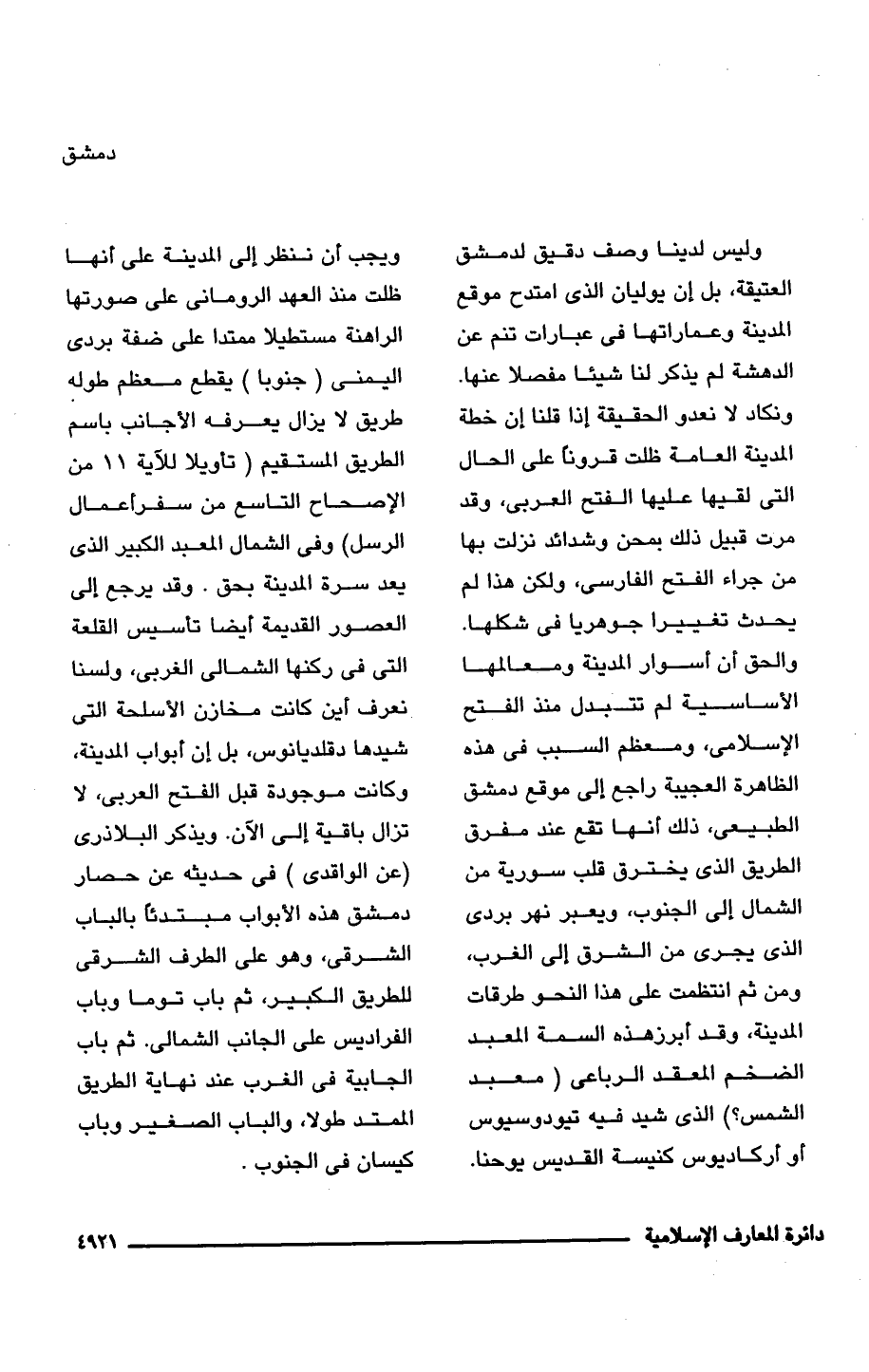 وليس لدينا وصف دقيق لدمشق العتيقة، بل إن يوليان الذي امتدح موقع المدينة وعماراتها في عبارات تنم عن الدهشة لم يذكر لنا شيئًا مفصلا عنها. ونكاد لا نعدو الحقيقة إذا قلنا إن خطة المدينة العامة ظلت قرونا على الحال التي لقيها عليها الفتح العربي، وقد مرت قبيل ذلك بمحن وشدائد نزلت بها من جراء الفتح الفارسي، ولكن هذا لم يحدث تغييرا جوهريا في شكلها. والحق أن أسوار المدينة ومعالمها الأساسية لم تتبدل منذ الفتح الإِسلامى، ومعظم السبب في هذه الظاهرة العجيبة راجع إلى موقع دمشق الطبيعى، ذلك أنها تقع عند مفرق الطريق الذي يخترق قلب سورية من الشمال إلى الجنوب، ويعبر نهر بردى الذي يجرى من الشرق إلى الغرب، ومن ثم انتظمت على هذا النحو طرقات المدينة، وقد أبرز هذه السمة المعبد الضخم المعقد الرباعى (معبد الشَّمس؟ ) الذي شيد فيه تيودوسيوس أو أركاديوس كنيسة القديس يوحنا.