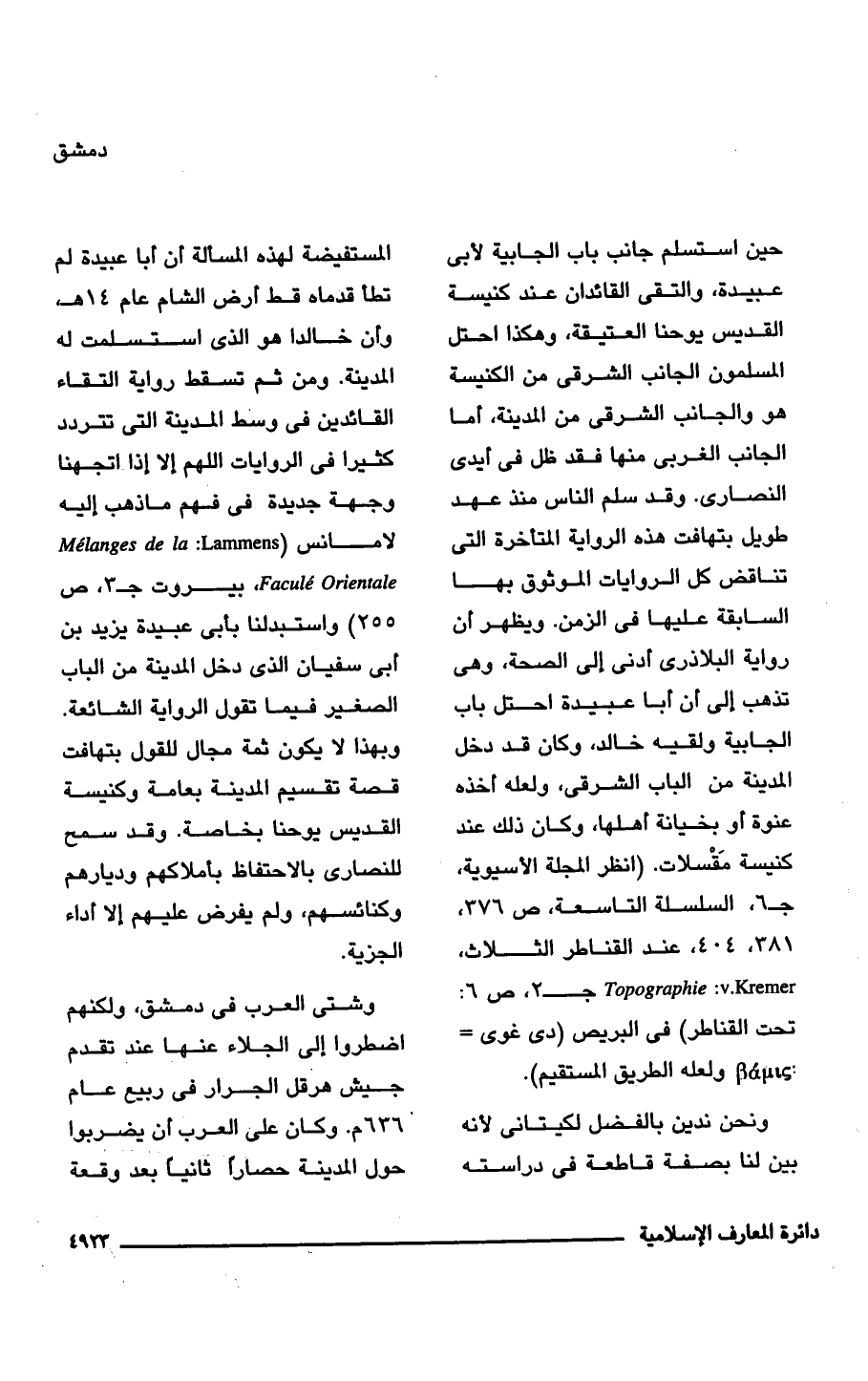 ونحن ندين بالفضل لكيتانى لأنه بين لنا بصفة قاطعة في دراسته المستفيضة لهذه المسألة أن أَبا عبيدة لم تطأ قدماه قط أرض الشَّام عام 14 هـ، وأن خالدا هو الذي استسلمت له المدينة. ومن ثم تسقط رواية التقاء القائدين في وسط المدينة التي تتردد كثيرا في الروايات اللهم إلَّا إذا اتجهنا وجهة جديدة في فهم ما ذهب إليه لامانس (Lammens: Melanges de la Facule Orientale, بيروت جـ 3، ص 255) واستبدلنا بأبى عبيدة يزيد بن أبي سفيان الذي دخل المدينة من الباب الصغير فيما تقول الرواية الشائعة. وبهذا لا يكون ثمة مجال للقول بتهافت قصة تقسيم المدينة بعامة وكنيسة القديس يوحنا بخاصة. وقد سمح للنصارى بالاحتفاظ بأملاكهم وديارهم وكنائسهم، ولم يفرض عليهم إلَّا أداء الجزية.