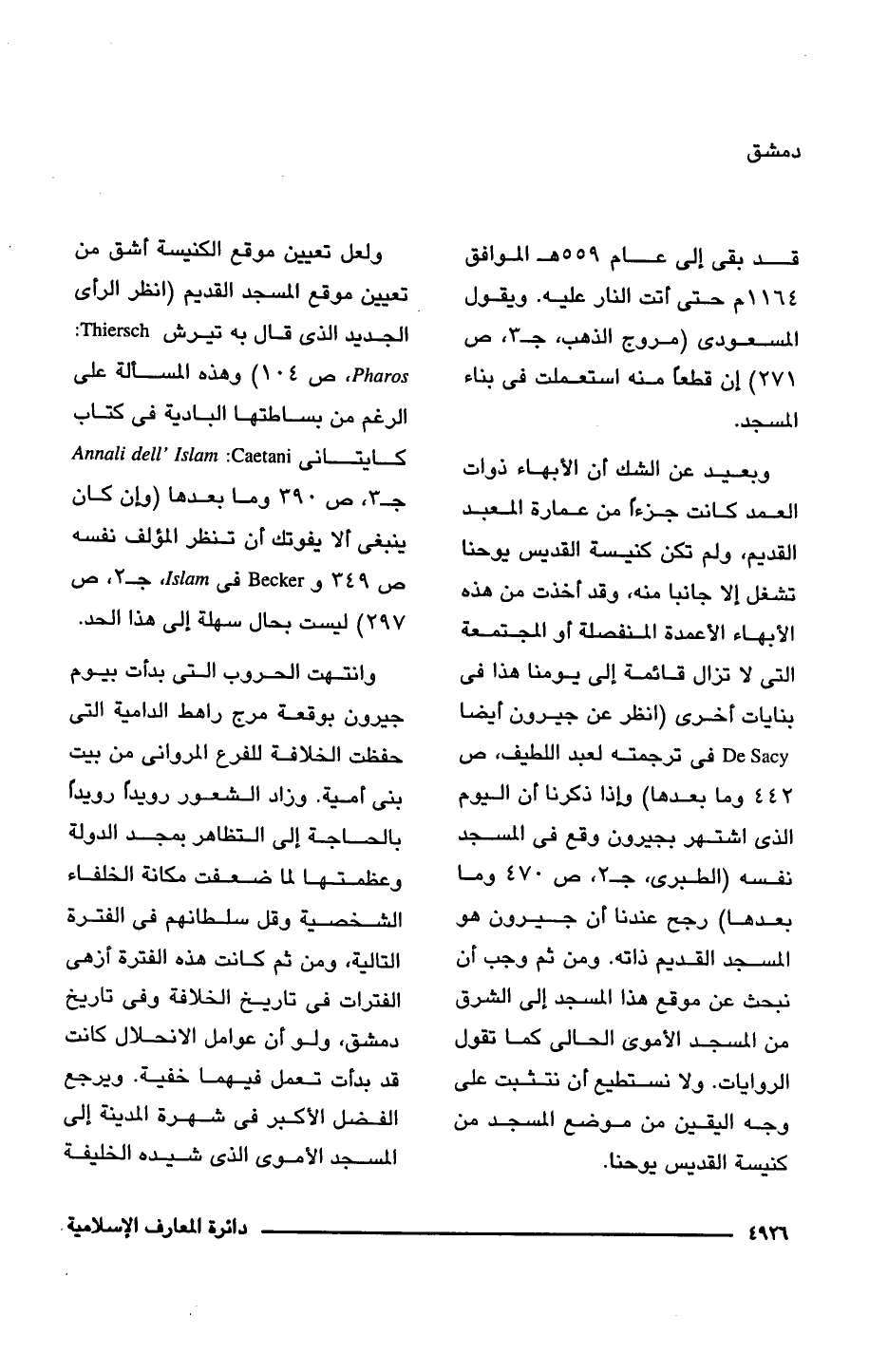 وبعيد عن الشك أن الأبهاء ذوات العمد كانت جزءًا من عمارة المعبد القديم، ولم تكن كنيسة القديس يوحنا تشغل إلَّا جانبا منه، وقد أخذت من هذه الأبهاء الأعمدة المنفصلة أو المجتمعة التي لا تزال قائمة إلى يومنا هذا في بنايات أخرى (انظر عن جيرون أَيضًا De Sacy في ترجمته لعبد اللطيف، ص 442 وما بعدها) وإذا ذكرنا أن اليوم الذي اشتهر بجيرون وقع في المسجد نفسه (الطبرى، جـ 2، ص 470 وما بعدها) رجح عندنا أن جيرون هو المسجد القديم ذاته. ومن ثم وجب أن نبحث عن موقع هذا المسجد إلى الشرق من المسجد الأموى الحالى كما تقول الروايات. ولا نستطيع أن نتثبت على وجه اليقين من موضع المسجد من كنيسة القديس يوحنا.