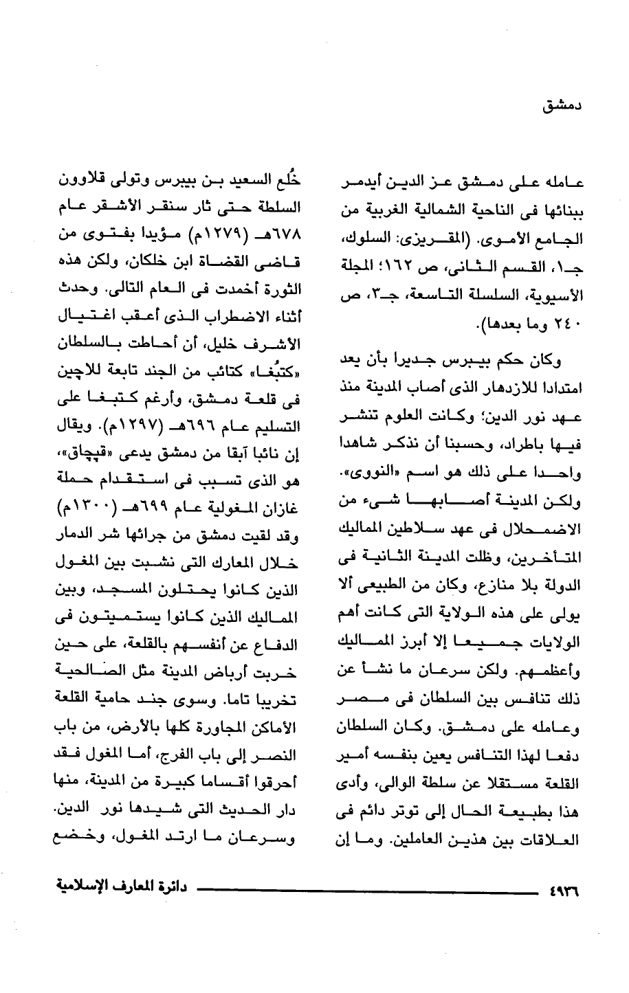 وكان حكم بيبرس جديرا بأن يعد امتدادا للازدهار الذي أصاب المدينة منذ عهد نور الدين؛ وكانت العلوم تنشر فيها باطراد، وحسبنا أن نذكر شاهدا واحدا على ذلك هو اسم "النووى". ولكن المدينة أصابها شئ من الاضمحلال في عهد سلاطين المماليك المتأخرين، وظلت المدينة الثَّانية في الدولة بلا منازع، وكان من الطبيعى ألا يولى على هذه الولاية التي كانت أهم الولايات جميعا إلا أبرز المماليك وأعظمهم. ولكن سرعان ما نشأ عن ذلك تنافس بين السلطان في مصر وعامله على دمشق. وكان السلطان دفعا لهذا التنافس يعين بنفسه أمير القلعة مستقلا عن سلطة الوالى، وأدى هذا بطبيعة الحال إلى توتر دائم في العلاقات بين هذين العاملين. وما إن خُلع السعيد بن بيبرس وتولى قلاوون السلطة حتَّى ثار سنقر الأشقر عام 678 هـ (1279 م) مؤيدا بفتوى من قاضى القضاة ابن خلكان، ولكن هذه الثورة أخمدت في العام التالى. وحدث أثناء الاضطراب الذي أعقب اغتيال الأشرف خليل، أن أحاطت بالسلطان "كتبُغا" كتائب من الجند تابعة للاجين في قلعة دمشق، وأرغم كتبغا على التسليم عام 696 هـ (1297 م). ويقال إن نائبا آبقًا من دمشق يدعى "قبجاق"، هو الذي تسبب في استقدام حملة غازان المغولية عام 699 هـ (1300 م) وقد لقيت دمشق من جرائها شر الدمار خلال المعارك التي نشبت بين المغول الذين كانوا يحتلون المسجد، وبين المماليك الذين كانوا يستميتون في الدفاع عن أنفسهم بالقلعة، على حين خربت أرباض المدينة مثل الصالحية تخريبا تاما. وسوى جند حامية القلعة الأماكن المجاورة كلها بالأرض، من باب النصر إلى باب الفرج، أما المغول فقد أحرقوا أقسامًا كبيرة من المدينة، منها دار الحديث التي شيدها نور الدين. وسرعان ما ارتد المغول، وخضع