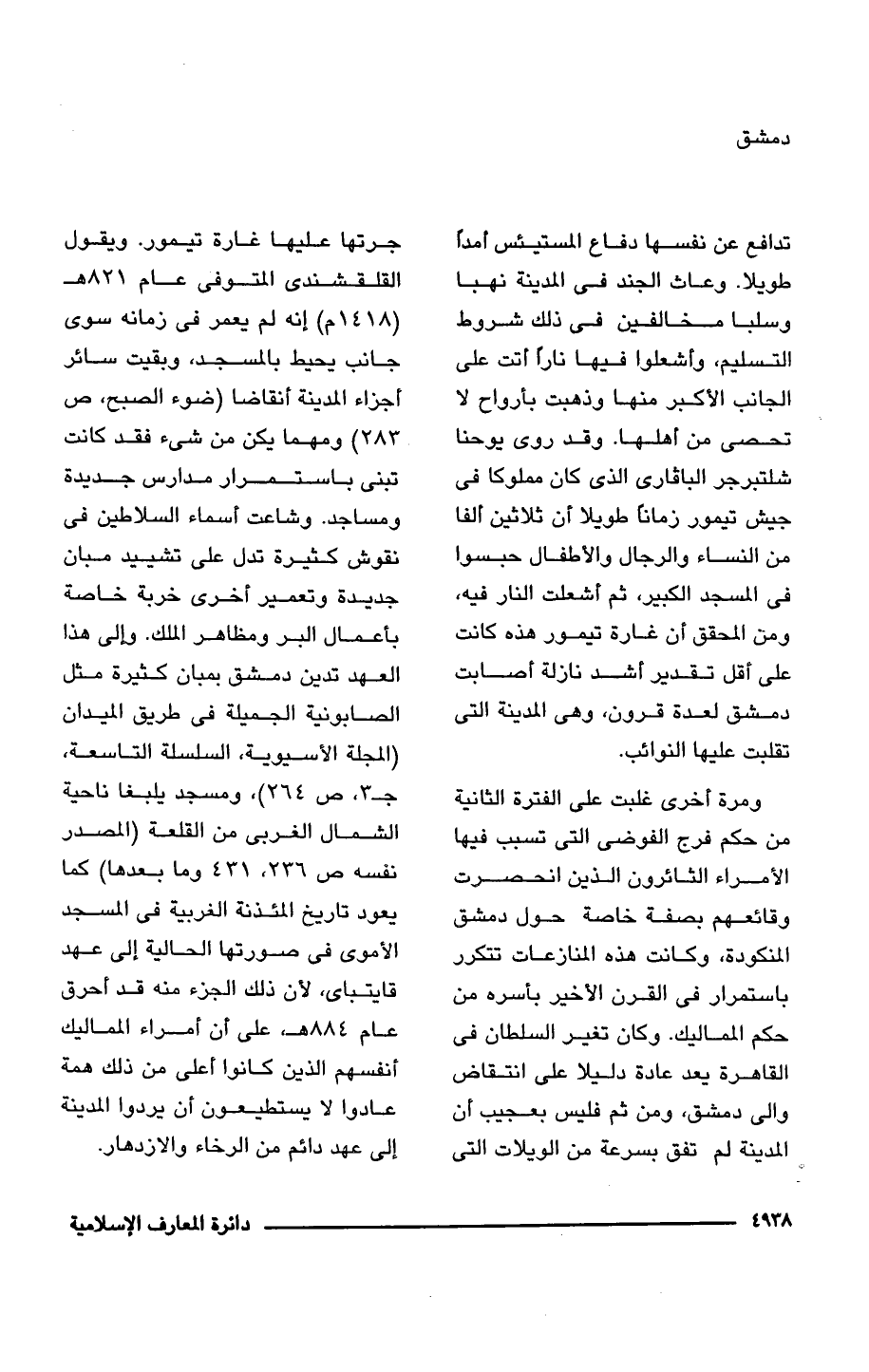 ومرة أخرى غلبت على الفترة الثَّانية من حكم فرج الفوضى التي تسبب فيها الأمراء الثائرون الذين انحصرت وقائعهم بصفة خاصة حول دمشق المنكودة، وكانت هذه المنازعات تتكرر باستمرار في القرن الأخير بأسره من حكم المماليك. وكان تغير السلطان في القاهرة يعد عادة دليلا على انتقاض والى دمشق، ومن ثم فليس بعجيب أن المدينة لم تفق بسرعة من الويلات التي جرتها عليها غارة تيمور. ويقول القلقشندى المتوفى عام 821 هـ (1418 م) إنه لم يعمر في زمانه سوى جانب يحيط بالمسجد، وبقيت سائر أجزاء المدينة أنقاضا (ضوء الصبح، ص 283) ومهما يكن من شئ فقد كانت تبنى باستمرار مدارس جديدة ومساجد. وشاعت أسماء السلاطين في نقوش كثيرة تدل على تشييد مبان جديدة وتعمير أخرى خربة خاصة بأعمال البر ومظاهر الملك. وإلى هذا العهد تدين دمشق بمبان كثيرة مثل الصابونية الجميلة في طريق الميدان (المجلة الأسيوية، السلسلة التاسعة، جـ 3، ص 264)، ومسجد يلبغا ناحية الشمال الغربى من القلعة (المصدر نفسه ص 236 , 431 وما بعدها) كما يعود تاريخ المئذنة الغربية في المسجد الأموى في صورتها الحالية إلى عهد قايتباى, لأن ذلك الجزء منه قد أحرق عام 884 هـ، على أن أمراء المماليك أنفسهم الذين كانوا أعلى من ذلك همة عادوا لا يستطيعون أن يردوا المدينة إلى عهد دائم من الرخاء والازدهار.