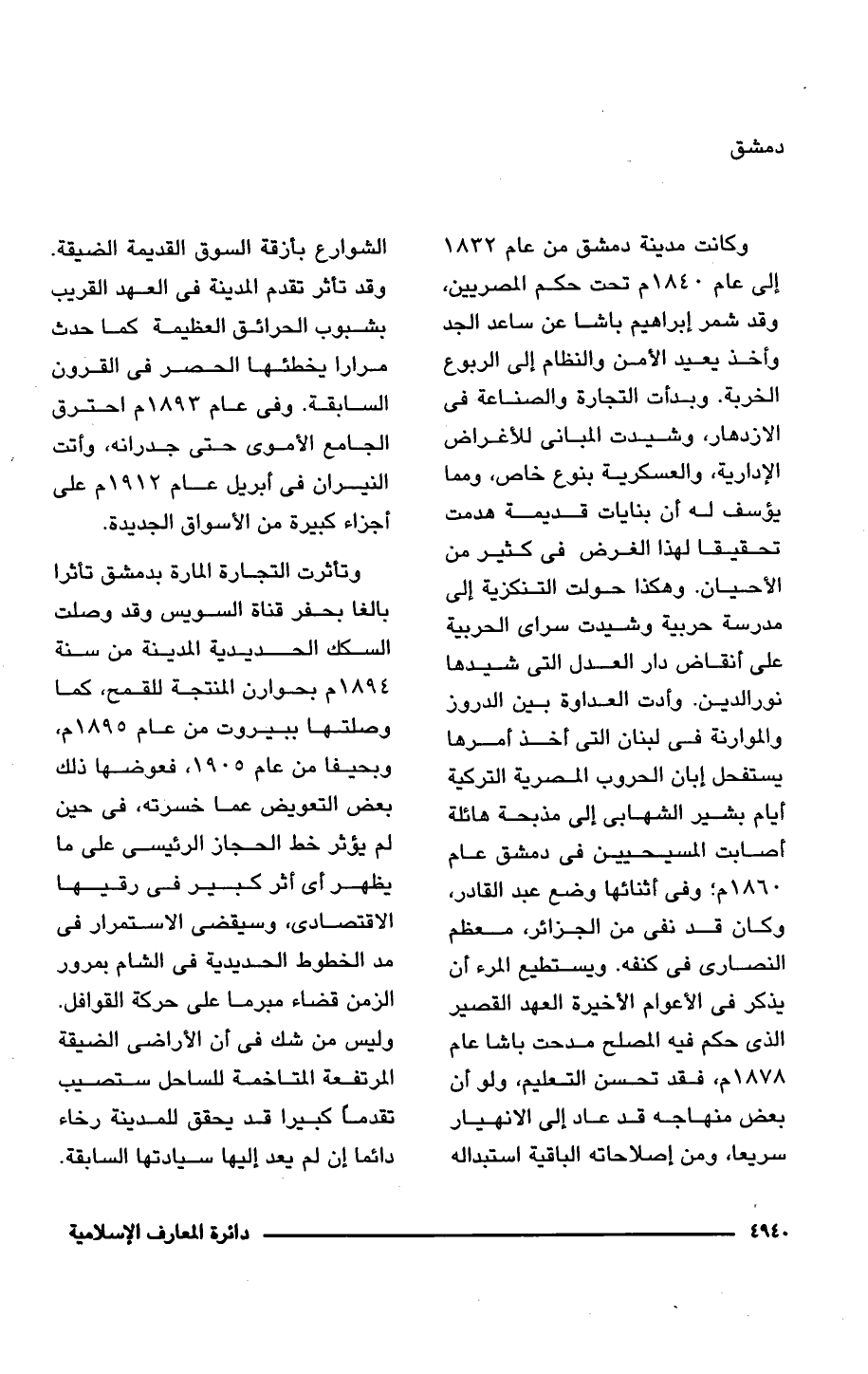 وكانت مدينة دمشق من عام 1832 إلى عام 1840 م تحت حكم المصريين، وقد شمر إبراهيم باشا عن ساعد الجد وأخذ يعيد الأمن والنظام إلى الربوع الخربة. وبدأت التجارة والصناعة في الازدهار، وشيدت المبانى للأغراض الإدارية، والعسكرية بنوع خاص، ومما يؤسف له أن بنايات قديمة هدمت تحقيقا لهذا الغرض في كثير من الأحيان. وهكذا حولت التنكزية إلى مدرسة حربية وشيدت سراى الحربية على أنقاض دار العدل التي شيدها نور الدين. وأدت العداوة بين الدروز والموارنة في لبنان التي أخذ أمرها يستفحل إبان الحروب المصرية التركية أيام بشير الشهابى إلى مذبحة هائلة أصابت المسيحيين في دمشق عام 1860 م؛ وفي أثنائها وضع عبد القادر، وكان قد نفي من الجزائر، معظم النصارى في كنفه. ويستطيع المرء أن يذكر في الأعوام الأخيرة العهد القصير الذي حكم فيه المصلح مدحت باشا عام 1878 م، فقد تحسن التعليم، ولو أن بعض منهاجه قد عاد إلى الإنهيار سريعا، ومن إصلاحاته الباقية استبداله الشوارع بأزقة السوق القديمة الضيقة. وقد تأثر تقدم المدينة في العهد القريب بشبوب الحرائق العظيمة كما حدث مرارا يخطئها الحصر في القرون السابقة. وفي عام 1893 م احترق الجامع الأموى حتَّى جدرانه، وأَتت النيران في أبريل عام 1912 م على أجزاء كبيرة من الأسواق الجديدة.