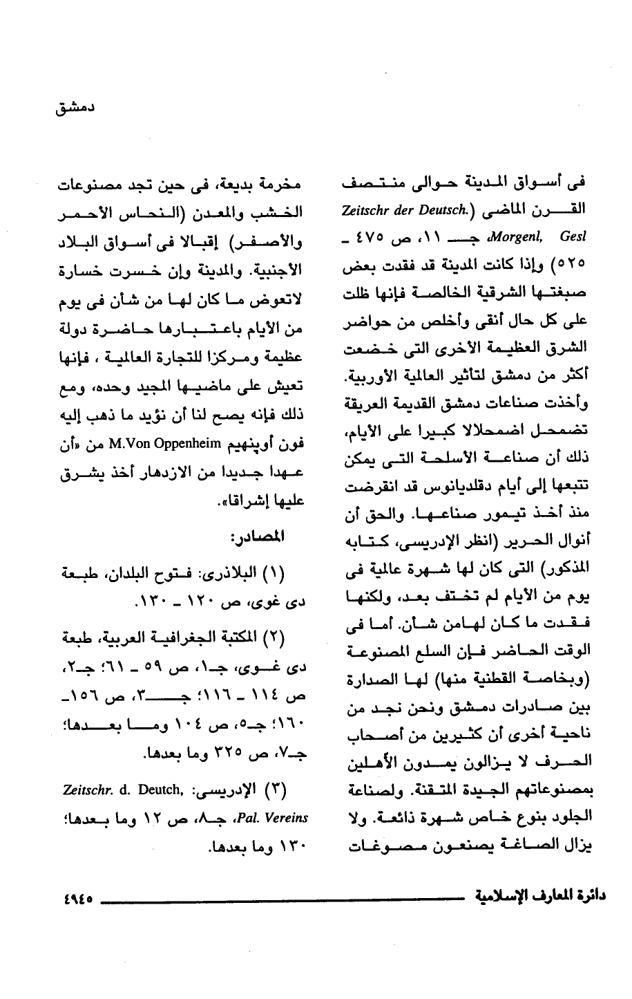 في أسواق المدينة حوالي منتصف القرن الماضى (Zeitschr der Deutsch Morgenl, Gesl, جـ 11، ص 475 - 525) وإذا كانت المدينة قد فقدت بعض صبغتها الشَّرقية الخالصة فإنَّها ظلت على كل حال أنقى وأخلص من حواضر الشرق العظيمة الأخرى التي خضعت أكثر من دمشق لتأثير العالمية الأوربية. وأخذت صناعات دمشق القديمة العريقة تضمحل اضمحلالا كبيرًا على الأيام، ذلك أن صناعة الأسلحة التي يمكن تتبعها إلى أيام دقلديانوس قد انقرضت منذ أخذ تيمور صناعها. والحق أن أنوال الحرير (انظر الإدريسى، كتابه المذكور) التي كان لها شهرة عالمية في يوم من الأيام لم تختف بعد، ولكنها فقدت ما كان لها من شأن. أما في الوقت الحاضر فإن السلع المصنوعة (وبخاصة القطنية منها) لها الصدارة بين صادرات دمشق ونحن نجد من ناحية أخرى أن كثيرين من أصحاب الحرف لا يزالون يمدون الأهلين بمصنوعاتهم الجيدة المتقنة. ولصناعة الجلود بنوع خاص شهرة ذائعة. ولا يزال الصاغة يصنعون مصوغات مخرمة بديعة، في حين تجد مصنوعات الخشب والمعدن (النحاس الأحمر والأصفر) إقبالا في أسواق البلاد الأجنبية. والمدينة وإن خسرت خسارة لا تعوض ما كان لها من شأن في يوم من الأيام باعتبارها حاضرة دولة عظيمة ومركزا للتجارة العالمية، فإنَّها تعيش على ماضيها المجيد وحده، ومع ذلك فإنَّه يصح لنا أن نؤيد ما ذهب إليه فون أوبنهيم M.Von Oppenheim من "أن عهدا جديدا من الازدهار أخذ يشرق عليها إشراقا".