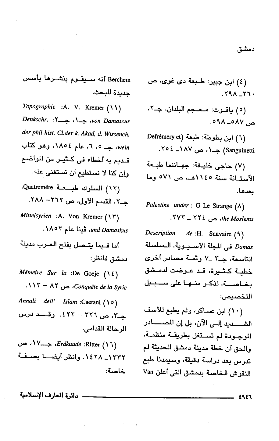 (9) H. Sauvaire: Description de Damas في المجلة الأسيوية، السلسلة التاسعة، جـ 3 - 7 وثمة مصادر أخرى خطية كثيرة، قد عرضت لدمشق بخاصة، نذكر منها على سبيل التخصيص: