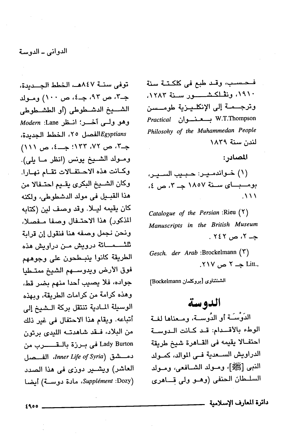 الدَوْسَة أو الدُوسة، ومعناها لغة الوطء بالأقدام: قد كانت الدوسة احتفالا يقيمه في القاهرة شيخ طريقة الدراويش السعدية في الموالد، كمولد النبي [- صلى الله عليه وسلم -]، ومولد الشافعى، ومولد السلطان الحنفي (وهو ولى قاهرى توفي سنة 847 هـ, الخطط الجديدة، جـ 3، ص 93، جـ 4، ص 100) ومولد الشيخ الدشطوطى (أو الطشطوطى وهو ولى آخر؛ انظر: Lane Modern Egyptians الفصل 25، الخطط الجديدة، جـ 3، ص 72 , 133؛ جـ 4، ص 111) ومولد الشيخ يونس (انظر ما يلى). وكانت هذه الاحتفالات تقام نهارا. وكان الشيخ البكري يقيم احتفالا من هذا القبيل في مولد الدشطوطى، ولكنه كان يقيمه ليلا. وقد وصف لين (كتابه المذكور) هذا الاحتفال وصفا مفصلا، ونحن نجمل وصفه هنا فنقول إن قرابة ثلثمائة درويش من دراويش هذه الطريقة كانوا ينبطحون على وجوههم فوق الأرض ويدوسهم الشيخ ممتطيا جواده، فلا يصيب أحدا منهم بضر قط، وهذه كرامة من كرامات الطريقة، وبهذه الوسيلة المادية تنتقل بركة الشيخ إلى أتباعه. ويقام هذا الاحتفال في غير ذلك من البلاد، فقد شاهدته الليدى برتون Lady Burton في برزة بالقرب من دمشق (Inner Life of Syria , الفصل العاشر) ويشير دوزى في هذا الصدد (Supplement: Dozy, مادة دوسة) أيضا