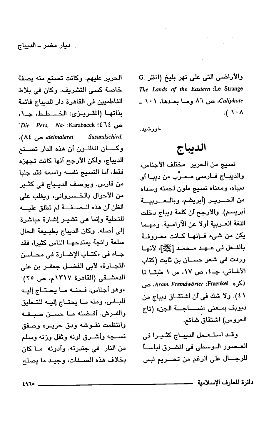 نسيج من الحرير مختلف الأجناس، والديباج فارسي معرَّب من ديبا أو ديباه، ومعناه نسيج ملون لحمته وسداه من الحرير (أبريشم، وبالعربية أبريسم). والأرجح أن كلمة ديباج دخلت اللغة العربية أولا عن الآرامية. ومهما يكن من شئ فإنَّها كانت معروفة بالفعل في عهد محمَّد [- صلى الله عليه وسلم -] , لأنها وردت في شعر حسان بن ثابت (كتاب الأغاني، جـ 4، ص 17، س 1 طبقا لما ذكره Aram. Fremdworter: Fraenkel ص 41). ولا شك في أن اشتقاق ديباج من ديوبف بمعنى "نساجة الجن" (تاج العروس) اشتقاقَ شائع.