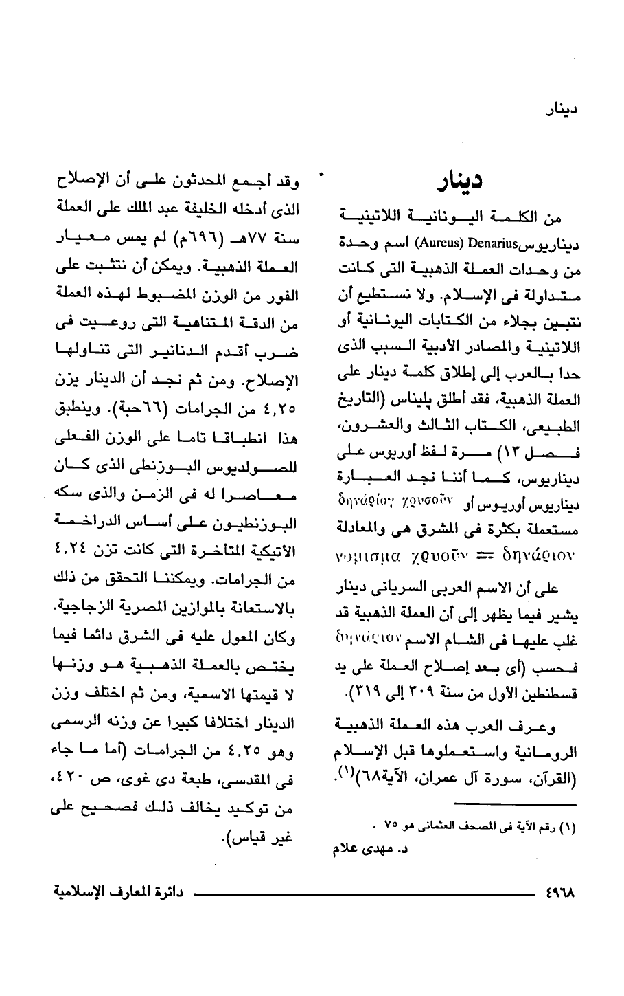 وعرف العرب هذه العملة الذهبية الرومانية واستعملوها قبل الإِسلام (القرآن، سورة آل عمران، الآية 68) (¬1).