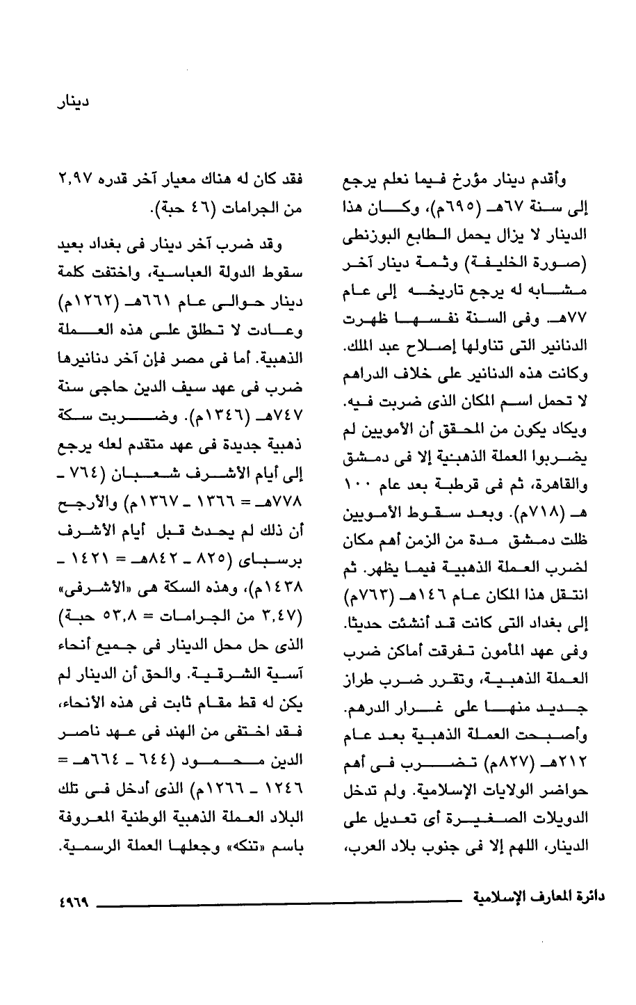 وأقدم دينار مؤرخ فيما نعلم يرجع إلى سنة 67 هـ (695 م)، وكان هذا الدينار لا يزال يحمل الطابع البوزنطى (صورة الخليفة) وثمة دينار آخر مشابه له يرجع تاريخه إلى عام 77 هـ. وفي السنة نفسها ظهرت الدنانير التي تناولها إصلاح عبد الملك. وكانت هذه الدنانير على خلاف الدراهم لا تحمل اسم المكان الذي ضربت فيه. ويكاد يكون من المحقق أن الأمويين لم يضربوا العملة الذهبية إلَّا في دمشق والقاهرة، ثم في قرطبة بعد عام 100 هـ (718 م). وبعد سقوط الأمويين ظلت دمشق مدة من الزمن أهم مكان لضرب العملة الذهبية فيما يظهر. ثم انتقل هذا المكان عام 146 هـ (763 م) إلى بغداد التي كانت قد أنشئت حديثًا. وفي عهد المأمون تفرقت أماكن ضرب العملة الذهبية، وتقرر ضرب طراز جديد منها على غرار الدرهم. وأصبحت العملة الذهبية بعد عام 212 هـ (827 م) تضرب في أهم حواضر الولايات الإِسلامية. ولم تدخل الدويلات الصغيرة أي تعديل على الدينار، اللهم إلَّا في جنوب بلاد العرب، فقد كان له هناك معيار آخر قدره 2.97 من الجرامات (46 حبة).