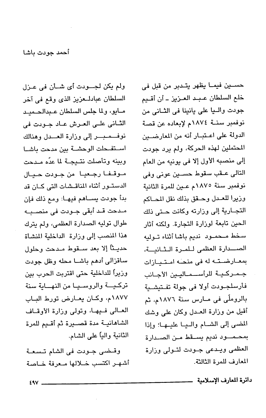 حسين فيما يظهر يتدبر من قبل فى خلع السلطان عبد العزيز- أن أقيم جودت واليا على يانينا فى الثانى من نوفمبر سنة 1874 م لإبعاده عن قصة الدولة على اعتبار أنه من المعارضين المحتملين لهذه الحركة، ولم يرد جودت إلى منصبه الأول إلا فى يونيه من العام التالى عقب سقوط حسين عونى وفى نوفمبر سنة 1875 م عين للمرة الثانية وزيرا للعدل وحقق بذلك نقل المحاكم التجارية إلى وزارته وكانت حتى ذلك الحين تابعة لوزارة التجارة. ولكنه أثار سخط محمود نديم باشا أثناء توليه الصدارة العظمى للمرة الثانية، بمعارضته له فى منخه امتيازات جمركية للرأسماليين الأجانب فأرسل جودت أولا فى جولة تفتيشية بالروملّى فى هارس سنة 1876 م، ثم أقيل من وزارة العدل وكان على وشك المضى إلى الشام واليا عليها؛ وإذا بمحمود نديم يسقط من الصدارة العظمى ويدعى جودت لتولى وزارة المعارف للمرة الثالثة.