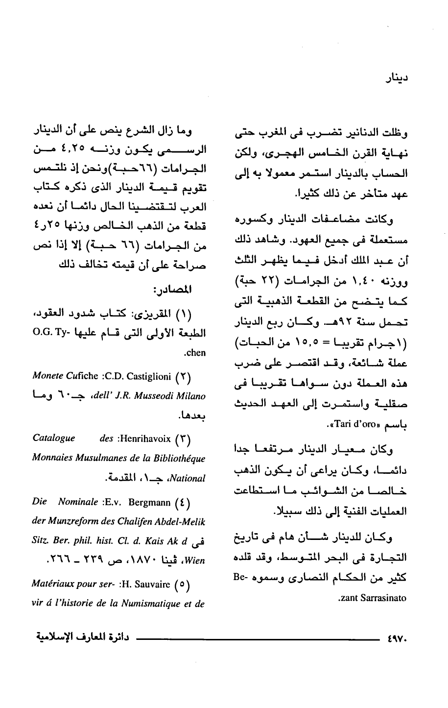 وما زال الشرع ينص على أن الدينار الرسمى يكون وزنه 4,25 من الجرامات (66 حبة) ونحن إذ نلتمس تقويم قيمة الدينار الذي ذكره كتاب العرب لتقتضينا الحال دائمًا أن نعده قطعة من الذهب الخالص وزنها 4,25 من الجرامات (66 حبة) إلَّا إذا نص صراحة على أن قيمته تخالف ذلك.