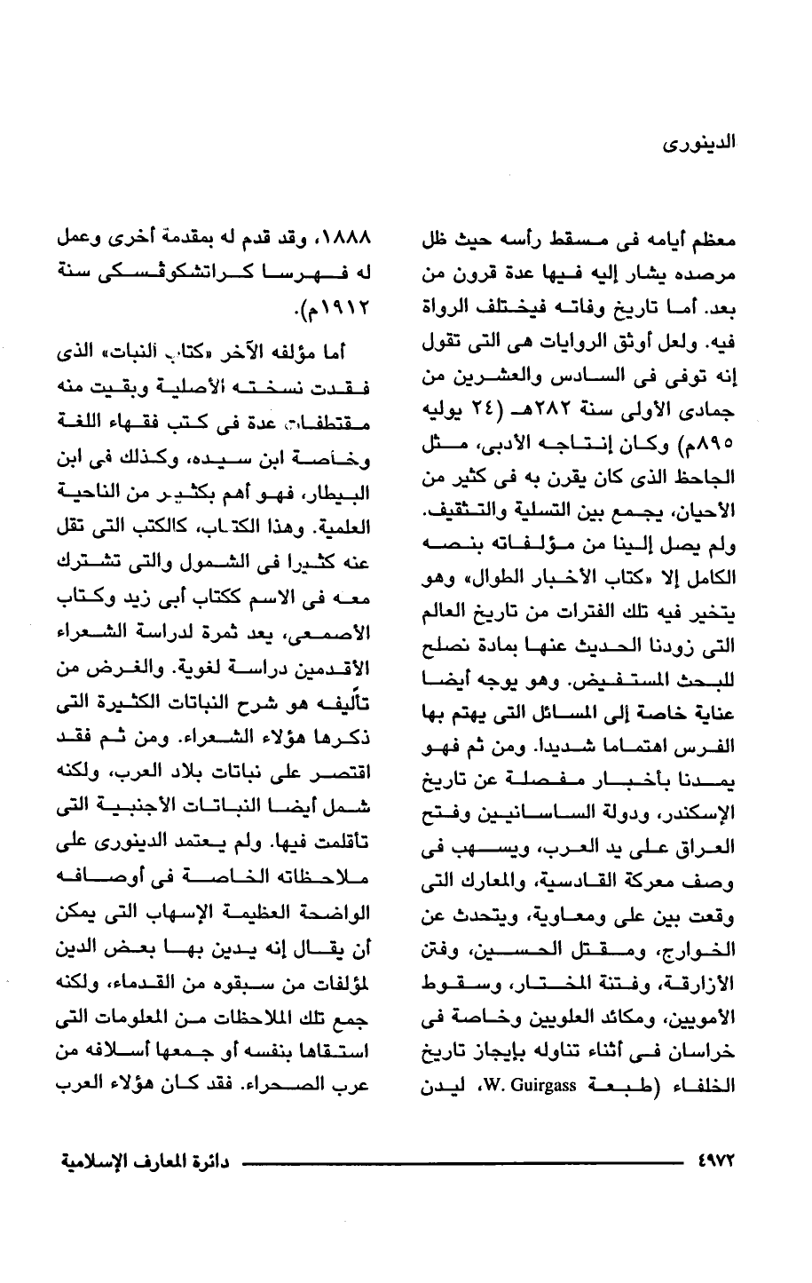 معظم أيامه في مسقط رأسه حيث ظل مرصده يشار إليه فيها عدة قرون من بعد. أما تاريخ وفاته فيختلف الرواة فيه. ولعل أوثق الروايات هي التي تقول إنه توفي في السادس والعشرين من جمادى الأولى سنة 282 هـ (24 يوليه 895 م) وكان إنتاجه الأدبى، مثل الجاحظ الذي كان يقرن به في كثير من الأحيان، يجمع بين التسلية والتثقيف. ولم يصل إلينا من مؤلفاته بنصه الكامل إلَّا "كتاب الأخبار الطوال" وهو يتخير فيه تلك الفترات من تاريخ العالم التي زودنا الحديث عنها بمادة نصلح للبحث المستفيض. وهو يوجه أَيضًا عناية خاصة إلى المسائل التي يهتم بها الفرس اهتماما شديدًا. ومن ثم فهو يمدنا بأخبار مفصلة عن تاريخ الإسكندر، ودولة الساسانيين وفتح العراق على يد العرب، ويسهب في وصف معركة القادسية، والمعارك التي وقعت بين على ومعاوية، ويتحدث عن الخوارج، ومقتل الحسين، وفتن الأزارقة، وفتنة المختار، وسقوط الأمويين، ومكائد العلويين وخاصة في خراسان في أثناء تناوله بإيجاز تاريخ الخلفاء (طبعة W. Guirgass , ليدن 1888, وقد قدم له بمقدمة أخرى وعمل له فهرسا كراتشكوفسكى سنة 1912 م).
