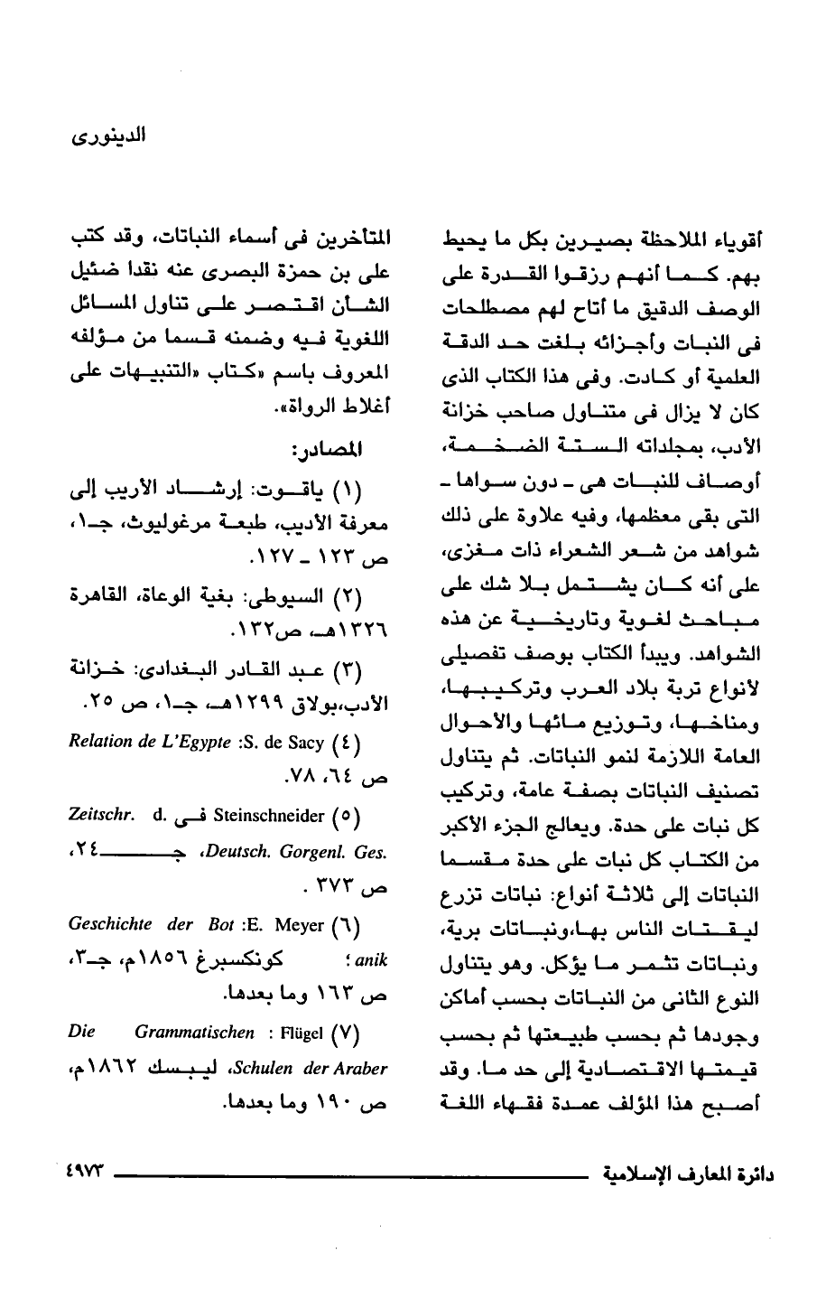 أقوياء الملاحظة بصيرين بكل ما يحيط بهم. كما أنَّهم رزقوا القدرة على الوصف الدقيق ما أتاح لهم مصطلحات في النبات وأجزائه بلغت حد الدقة العلمية أو كادت. وفي هذا الكتاب الذي كان لا يزال في متناول صاحب خزانة الأدب، بمجلداته الستة الضخمة، أوصاف للنبات هي -دون سواها- التي بقى معظمها، وفيه علاوة على ذلك شواهد من شعر الشعراء ذات مغزى، على أنَّه كان يشتمل بلا شك على مباحث لغوية وتاريخية عن هذه الشواهد. ويبدأ الكتاب بوصف تفصيلى لأنواع تربة بلاد العرب وتركيبها، ومناخها، وتوزيع مائها والأحوال العامة اللازمة لنمو النباتات. ثم يتناول تصنيف النباتات بصفة عامة، وتركيب كل نبات على حدة. ويعالج الجزء الأكبر من الكتاب كل نبات على حدة مقسما النباتات إلى ثلاثة أنواع: نباتات تزرع ليقتات الناس بها، ونباتات برية، ونباتات تثمر ما يؤكل. وهو يتناول النوع الثاني من النباتات بحسب أماكن وجودها ثم بحسب طبيعتها ثم بحسب قيمتها الاقتصادية إلى حد ما. وقد أصبح هذا المؤلف عمدة فقهاء اللغة المتأخرين في أسماء النباتات، وقد كتب علي بن حمزة البصرى عنه نقدا ضئيل الشأن اقتصر على تناول المسائل اللغوية فيه وضمنه قسما من مؤلفه المعروف باسم "كتاب التنبيهات على أغلاط الرواة".