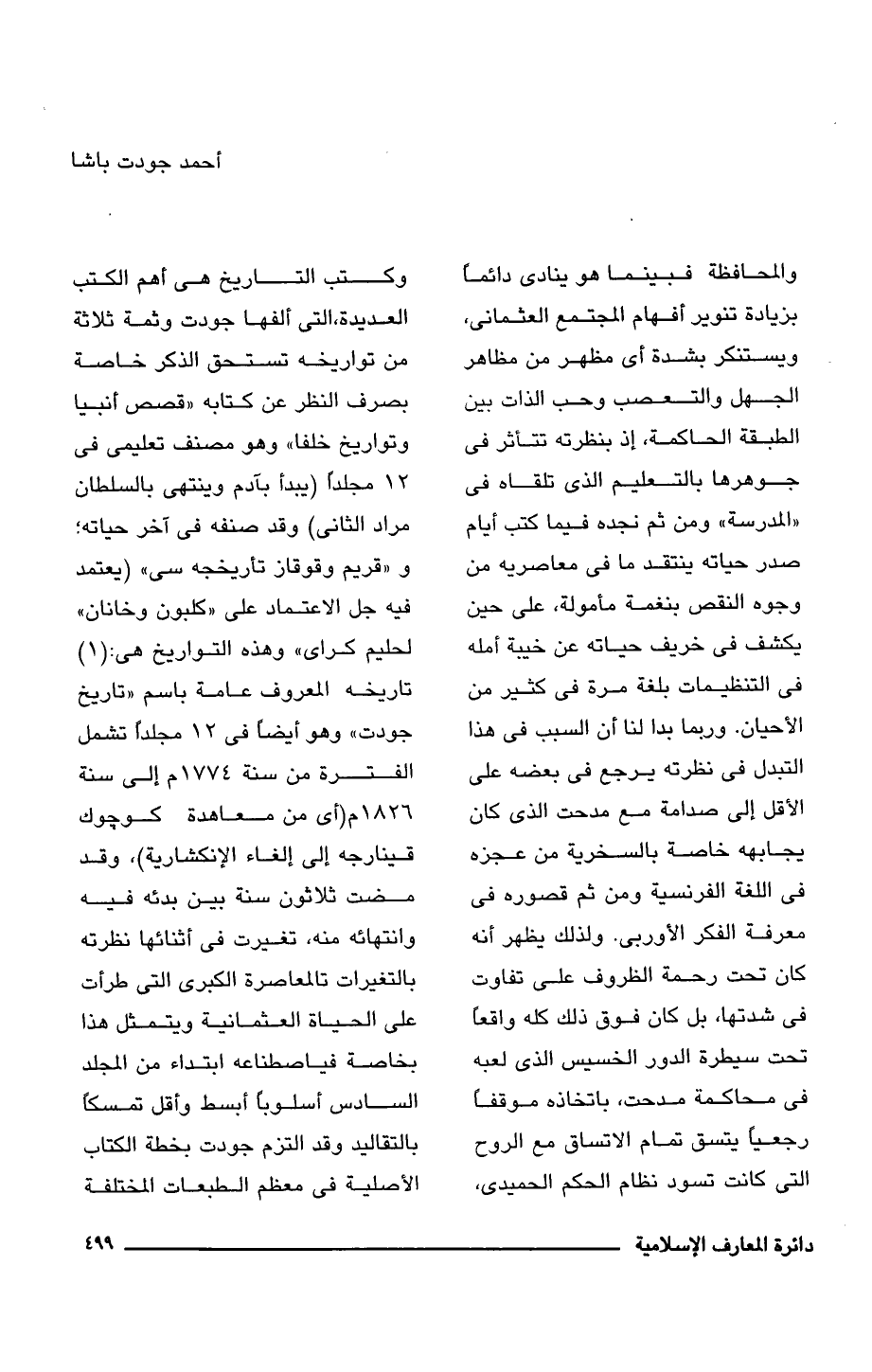والمحافظة فبينما هو ينادى دائمًا بزيادة تنوير أفهام المجتمع العثمانى، ويستنكر بشدة أى مظهر من مظاهر الجهل والتعصب وحب الذات بين الطبقة الحاكمة، إذ بنظرته تتأثر فى جوهرها بالتعليم الذى تلقاه فى "المدرسة" ومن ثم نجده فيما كتب أيام صدر حياته ينتقد ما فى معاصريه من وجوه النقص بنغمة مأمولة، على حين يكشف فى خريف حياته عن خيبة أمله فى التنظيمات بلغة مرة فى كثير من الأحيان. وربما بدا لنا أن السبب فى هذا التبدل فى نظرته يرجع فى بعضه على الأقل إلى صدامة مع مدحت الذى كان يجابهه خاصة بالسخرية من عجزه فى اللغة الفرنسية ومن ثم قصوره فى معرفة الفكر الأوربى. ولذلك يظهر أنه كان تحت رحمة الظروف على تفاوت فى شدتها، بل كان فوق ذلك كله واقعًا تحت سيطرة الدور الخسيس الذى لعبه فى محاكمة مدحت، باتخاذه موقفًا رجعيًا يتسق تمام الاتساق مع الروح التى كانت تسود نظام الحكم الحميدى، وكتب التاريخ هى أهم الكتب العديدة، التى ألفها جودت وثمة ثلاثة من تواريخه تستحق الذكر خاصة بصرف النظر عن كتابه "قصص أنبيا وتواريخ خلفا" وهو مصنف تعليمى فى 12 مجلدًا (يبدأ بآدم وينتهى بالسلطان مراد الثانى) وقد صنفه فى آخر حياته؛ و"قريم وقوقاز تأريخجه سى" (يعتمد فيه جل الاعتماد على "كلبون وخانان " لحليم كراى" وهذه التواريخ هى: (1) تاريخه المعروف عامة باسم "تاريخ جودت" وهو أيضًا فى 12 مجلدًا تشمل الفترة من سنة 1774 م إلى سنة 1826 م (أى من معاهدة كوجوك قينارجه إلى إلغاء الإنكشارية)، وقد مضت ثلاثون سنة بين بدئه فيه وانتهائه منه، تغيرت فى أثنائه نظرته بالتغيرات المعاصرة الكبرى التى طرأت على الحياة العثمانية ويتمثل هذا بخاصة في اصطناعه ابتداء من المجلد السادس أسلوبًا أبسط وأقل تمسكًا بالتقاليد وقد التزم جودت بخطة الكتاب الأصلية فى معظم الطبعات المختلفة