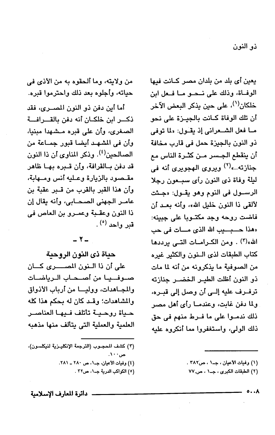 يعين أي بلد من بلدان مصر كانت فيها الوفاة، وذلك على نحو ما فعل ابن خلكان (¬1)، على حين يذكر البعض الآخر أن تلك الوفاة كانت بالجيزة على نحو ما فعل الشعرانى إذ يقول: "لما توفى ذو النون بالجيزة حمل في قارب مخافة أن ينقطع الجسر من كثرة الناس مع جنازته .. " (¬2) ويروى الهجويرى أنَّه في ليلة وفاة ذى النون رأى سبعون رجلًا الرسول في النوم وهو يقول: "جئت لألقى ذا النون خليل الله"، وأنه بعد أن فاضت روحه وجد مكتوبًا على جبينه: "هذا حبيب الله الَّذي مات في حب