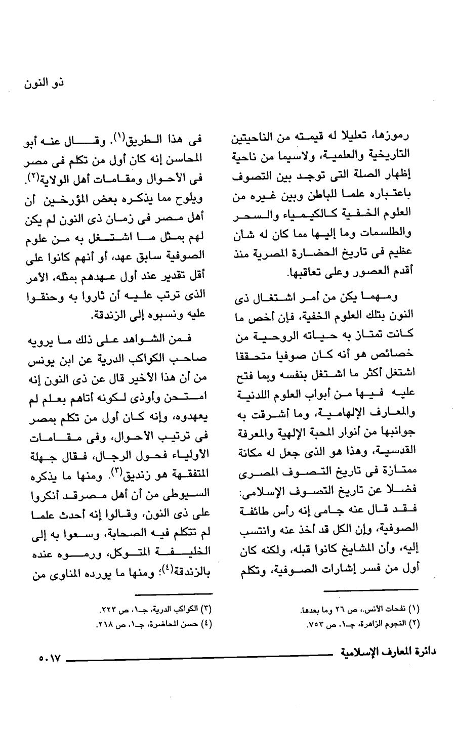 جوانبها من أنوار المحبة الإلهية والمعرفة القدسية، وهذا هو الَّذي جعل له مكانة ممتازة في تاريخ التصوف المصرى فضلًا عن تاريخ التصوف الإسلامى: فقد قال عنه جامى إنه رأس طائفة الصوفية، وإن الكل قد أخذ عنه وانتسب إليه، وأن المشايخ كانوا قبله، ولكنه كان أول من فسر إشارات الصوفية، وتكلم في هذا الطريق (¬1). وقال عنه أبو المحاسن إنه كان أول من تكلم في مصر في الأحوال ومقامات أهل الولاية (¬2).