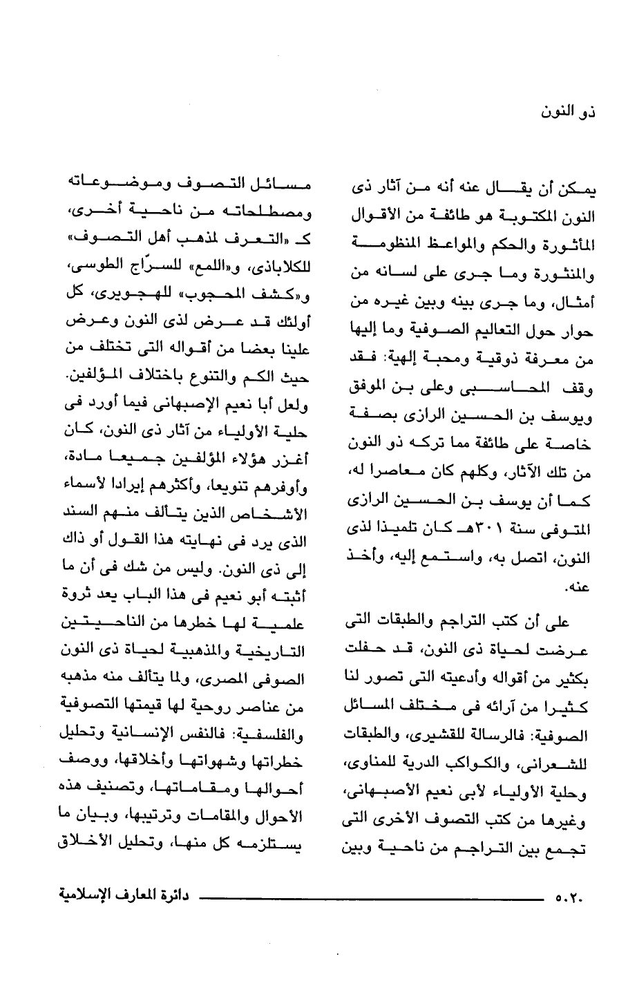 ولعل أبا نعيم الإصبهانى فيما أورد في حلية الأولياء من آثار ذى النون، كان أغزر هؤلاء المؤلفين جميعًا مادة، وأوفرهم تنويعًا، وأكثرهم إيرادًا لأسماء الأشخاص الذين يتألف منهم السند الَّذي يرد في نهايته هذا القول أو ذاك إلى ذى النون. وليس من شك في أن ما أثبته أبو نعيم في هذا الباب يعد ثروة علمية لها خطرها من الناحيتين التاريخية والمذهبية لحياة ذى النون الصوفى المصري، ولما يتألف منه مذهبه من عناصر روحية لها قيمتها التصوفية والفلسفية: فالنفس الإنسانية وتحليل خطراتها وشهواتها وأخلاقها، ووصف أحوالها ومقاماتها، وتصنيف هذه الأحوال والمقامات وترتيبها، وبيان ما يستلزمه كل منها، وتحليل الأخلاق