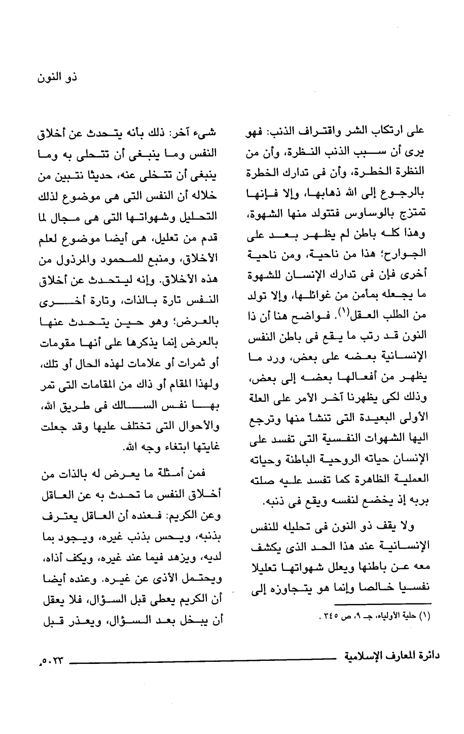 ولا يقف ذو النون في تحليله للنفس الإنسانية عند هذا الحد الَّذي يكشف معه عن باطنها ويعلل شهواتها تعليلًا نفسيًا خالصًا وإنما هو يتجاوزه إلى شيء آخر: ذلك بأنه يتحدث عن أخلاق النفس وما ينبغي أن تتحلى به وما ينبغي أن تتخلى عنه، حديثا نتبين من خلاله أن النفس التي هي موضوع لذلك التحليل وشهواتها التي هي مجال لما قدم من تعليل، هي أيضًا موضوع لعلم