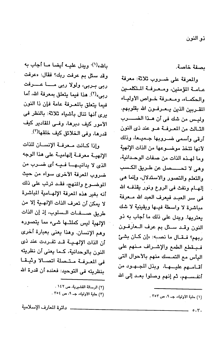 ربى" (¬2). هذا فيما يتعلق بمعرفة الله، أما فيما يتعلق بالمعرفة عامة فإن ذا النون يرى أنها تنال بأشياء ثلاثة: بالنظر في الأمور كيف دبرها، وفى المقادير كيف قدرها، وفى الخلائق كيف خلقها (¬3).