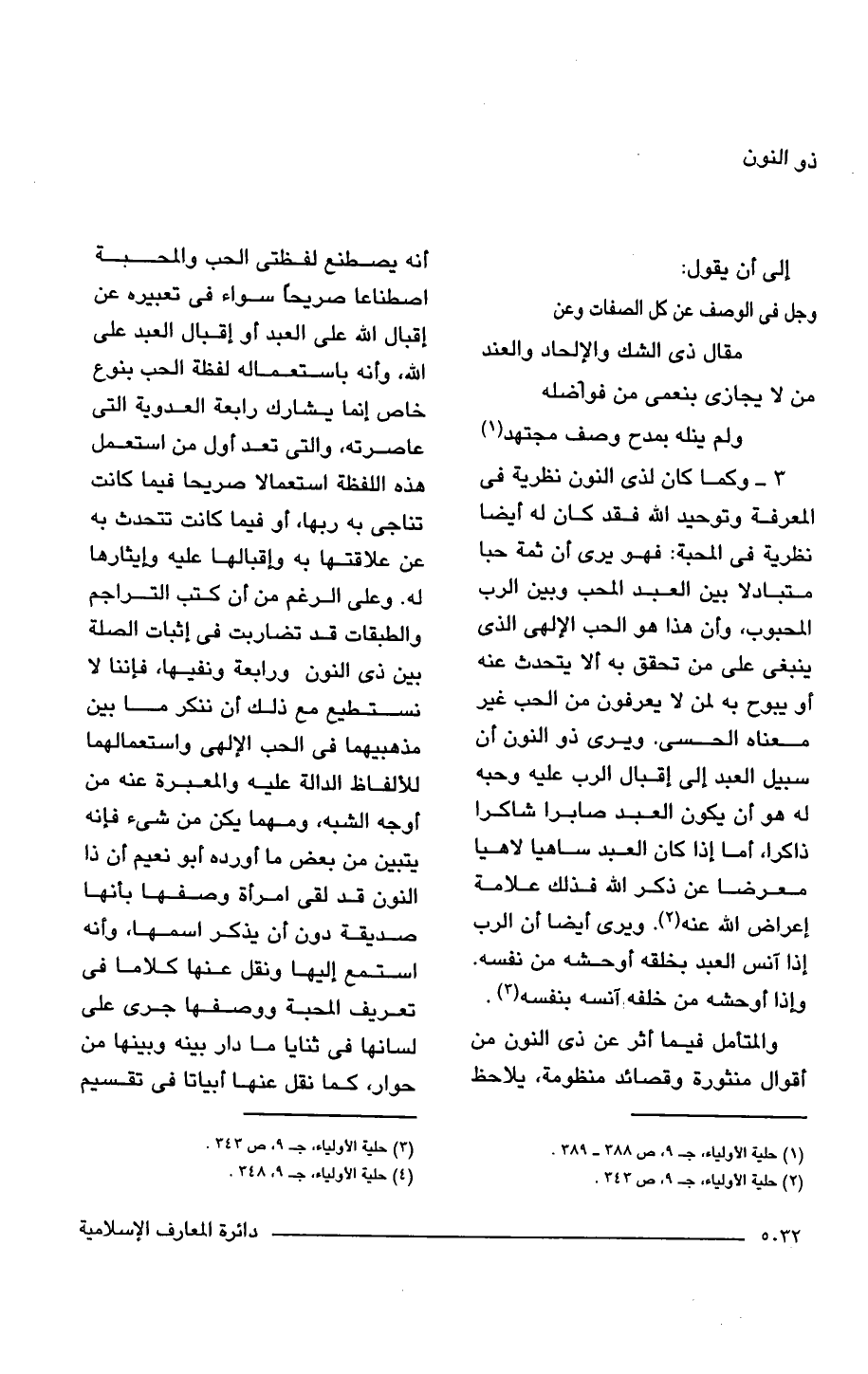 3 - وكما كان لذى النون نظرية في المعرفة وتوحيد الله فقد كان له أيضًا نظرية في المحبة: فهو يرى أن ثمة حبًا متبادلًا بين العبد المحب وبين الرب المحبوب، وأن هذا هو الحب الإلهى الَّذي ينبغي على من تحقق به ألا يتحدث عنه أو يبوح به لمن لا يعرفون من الحب غير معناه الحسى. ويرى ذو النون أن سبيل العبد إلى إقبال الرب عليه وحبه له هو أن يكون العبد صابرًا شاكرًا ذاكرًا، أما إذا كان العبد ساهيًا لاهيًا معرضًا عن ذكر الله فذلك علامة إعراض الله عنه (¬2). ويرى أيضًا أن الرب إذا آنس العبد بخلقه أوحشه من نفسه.