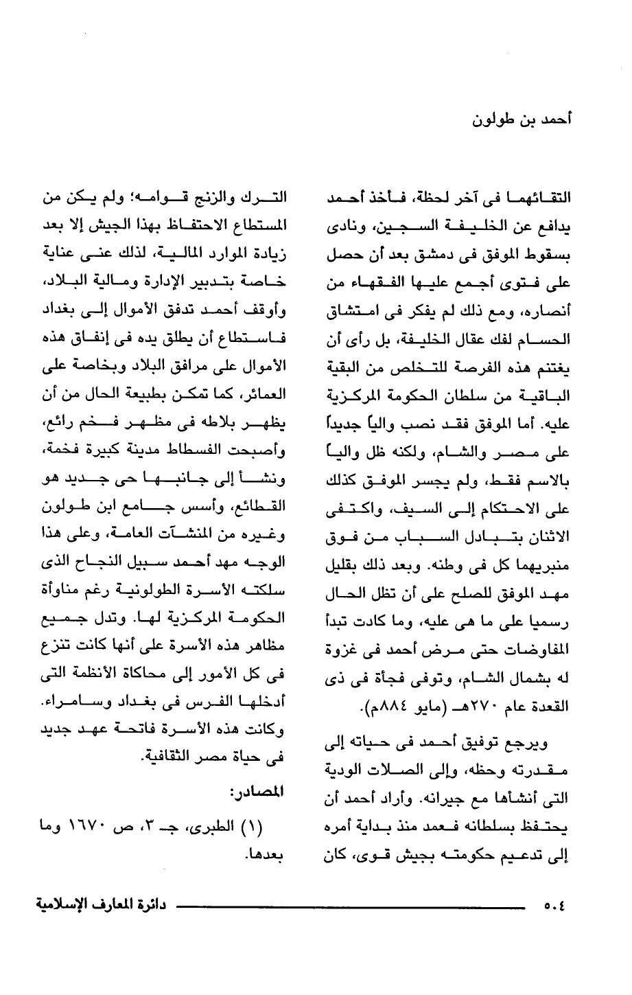 التقائهما فى آخر لحظة، فأخذ أحمد يدافع عن الخليفة السجين، ونادى بسقوط الموفق فى دمشق بعد أن حصل على فتوى أجمع عليها الفقهاء من أنصاره، ومع ذلك لم يفكر فى امتشاق الحسام لفك عقال الخليفة، بل رأى أن يغتنم هذه الفرصة للتخلص من البقية الباقية من سلطان الحكومة المركزية عليه. أما الموفق فقد نصب واليًا جديدًا على مصر والشام، ولكنه ظل واليًا بالاسم فقط، ولم يجسر الموفق كذلك على الاحتكام إلى السيف، واكتفى الاثنان بتبادل السباب من فوق منبريهما كل فى وطنه. وبعد ذلك بقليل مهد الموفق للصلح على أن تظل الحال رسميا على ما هى عليه، وما كادت تبدأ المفاوضات حتى مرض أحمد فى غزوة له بشمال الشام، وتوفى فجأة فى ذى القعدة عام 27 هـ (مايو 884 م).