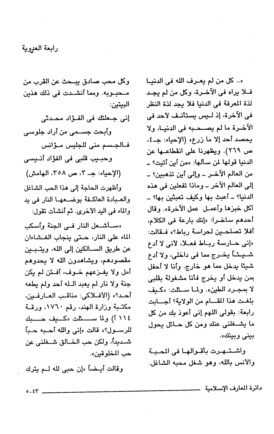 "سأشعل النار في الجنّة وأسكب الماء على النار، حتَّى ينجاب الغشاءان عن طريق السالكين إلى الله، ويتبين مقصودهم، ويشاهدون الله لا يحدوهم أمل ولا يفزعهم خوف، أفئن لم يكن جنة ولا نار لم يعبد الله أحد ولم يطعه أحد؟ " (الأفلاكى: مناقب العارفين، مكتبة وزارة الهند، رقم 1760، ورقة 114 أ) سئلت "كيف حبك للرسول؟ " قالت "إنى والله أحبه حبًا شديدًا، ولكن حب الخالق شغلنى عن حب المخلوقين".