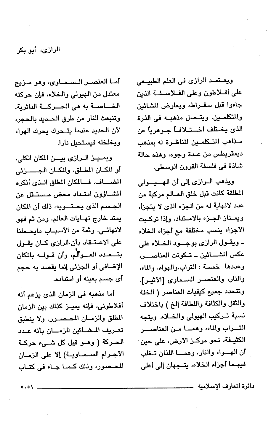 ويذهب الرازي إلى أن الهيولى المطلقة كانت قبل خلق العالم مركبة من عدد لا نهاية له من الجزء الَّذي لا يتجزأ، ويمتاز الجزء بالامتداد، واذا تركبت الأجزاء بنسب مختلفة مع أجزاء الخلاء - ويقول الرازي بوجود الخلاء على عكس المشائين - تكونت العناصر، وعددها خمسة: التراب، والهواء، والماء، والنار، والعنصر السماوى [الأثير].
