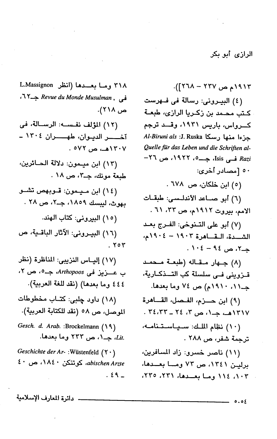 (4) البيرونى: رسالة في فهرست كتب محمد بن زكريا الرازي، طبعة كرواس، باريس 1931, وقد ترجم جزءا منها رسكا Al-Biruni als J. Ruska -Quelle fir das Leben and die Schriften al؛ Raz في Isis، ج 5، 1922، ص 26 - 50 [مصادر أخرى: