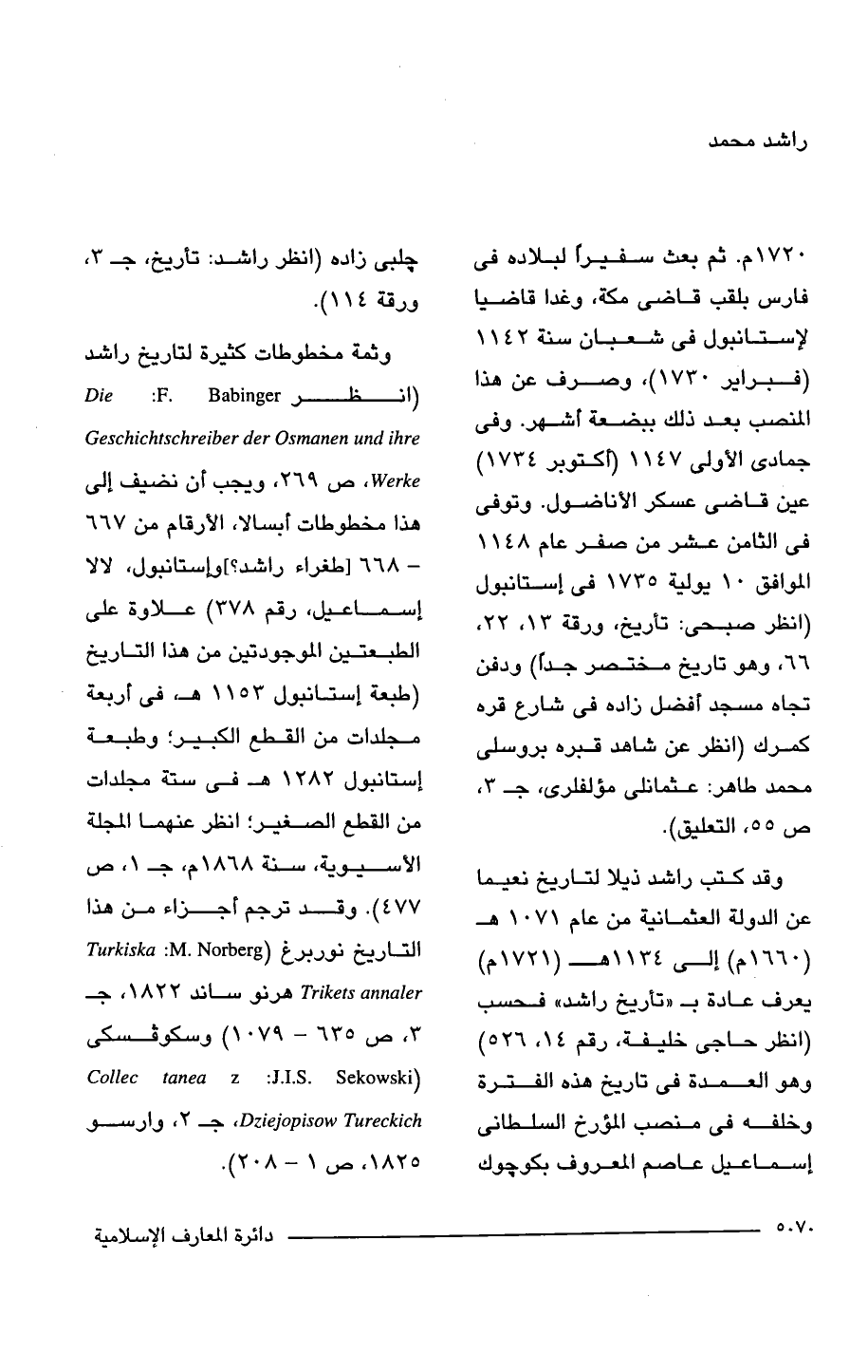 - 668 [طغراء راشد؟ ]، وإستانبول، لالا إسماعيل، رقم 378) علاوة على الطبعتين الموجودتين من هذا التاريخ (طبعة إستانبول 1153 هـ، في أربعة مجلدات من القطع الكبير؛ وطبعة إستانبول 1282 هـ في ستة مجلدات من القطع الصغير؛ انظر عنهما المجلة الأسيوية، سنة 1868 م، ج 1، ص 477). وقد ترجم أجزاء من هذا التاريخ نوربرغ (Trkiska: M. Norberg Trikets annaler هرنو ساند 1822، ج 3، ص 635 - 1079) ,وسكوفسكى (Collec tanea z J.I.S. Sekowski Dziejopisow Tureckich، ج 2، وارسو 1825، ص 1 - 208).
