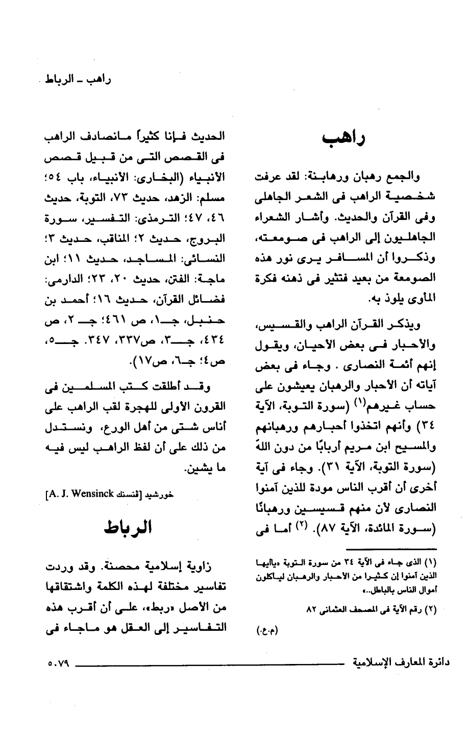 (سورة المائدة، الآية 87). (¬2) أما في الحديث فإنا كثيرًا ما نصادف الراهب في القصص التي من قبيل قصص الأنبياء (البخاري: الأنبياء، باب 54؛ مسلم: الزهد، حديث 73، التوبة، حديث 46، 47؛ الترمذى: التفسير، سورة البروج، حديث 2؛ المناقب، حديث 3؛ النسائي: المساجد، حديث 11؛ ابن ماجة: الفتن، حديث 20، 23؛ الدارمى: فضائل القرآن، حديث 16؛ أحمد بن حنبل، ج 1، ص 461؛ ج 2، ص 434، ج 3، ص 227، 337، 347.ج 5، ص 4؛ ج 6، ص 17).