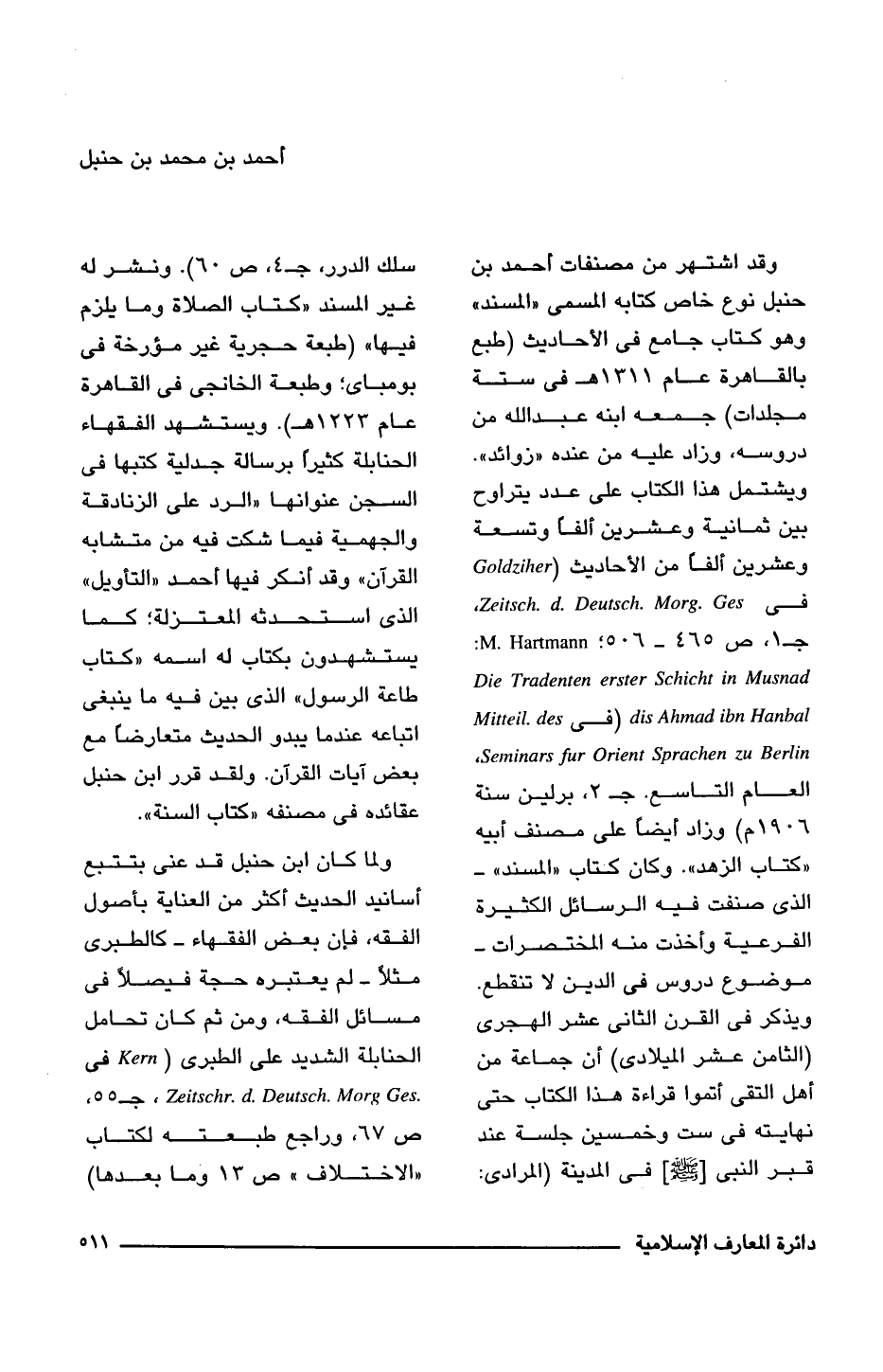 ولما كان ابن حنبل قد عنى بتتبع أسانيد الحديث أكثر من العناية بأصول الفقه، فإن بعض الفقهاء -كالطبرى مثلًا- لم يعتبره حجة فيصلًا فى مسائل الفقه، ومن ثم كان تحامل الحنابلة الشديد على الطبرى (kern فى zeitschr .d.Deutsch. Morg Ges، ج 55، ص 67، وراجع طبعته لكتاب "الاختلاف" ص 13 وما بعدها)