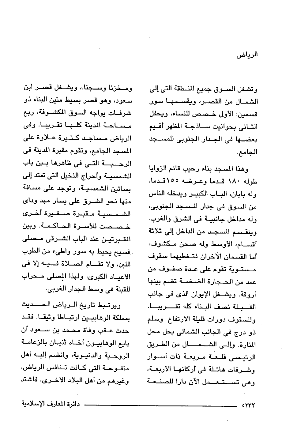 وهذا المسجد بناء رحيب قائم الزوايا طوله 180 قدما وعرضه 155 قدما، وله بابان، الباب الكبير ويدخله الناس من السوق فى جدار المسجد الجنوبى، وله مداخل جانبية فى الشرق والغرب. وينقسم المسجد من الداخل إلى ثلاثة أقسام، الأوسط وله صحن مكشوف، أما القسمان الآخران فتغطيهما سقوف مستوية تقوم على عدة صفوف من عمد من الحجارة الضخمة تضم بينها أروقة. ويشغل الإيوان الذى فى جانب القبلة نصف البناء كله تقريبا. وللسقوف دورات قليلة الارتفاع وسلم ذو درج فى الجانب الشمالى يحل محل المنارة. وإلى الشمال من الطريق الرئيسى قلعة مربعة ذات أسوار وشرفات هائلة فى أركانها الأربعة، وهى تستعمل الآن دارا للصنعة ومخزنا وسجنا، ويشغل قصر ابن سعود، وهو قصر بسيط متين البناء ذو شرفات يواجه السوق المكشوفة، ربع مساحة المدينة كلها تقريبا. وفى الرياض مساجد كثيرة علاوة على المسجد الجامع، وتقوم مقبرة المدينة فى الرحبة التى فى ظاهرها بين باب الشمسية وأحراج النخيل التى تمتد إلى بساتين الشمسية، وتوجد على مسافة منها نحو الشرق على يسار مهد وداى الشمسية مقبرة صغيرة أخرى خصصت للأسرة الحاكمة. وبين المقبرتين عند الباب الشرقى مصلى فسيح يحيط به سور واطئ من الطوب اللبن، ولا تقام الصلاة فيه إلا فى الأعياد الكبرى، ولهذا المصلى محراب للقبلة فى وسط الجدار الغربى.
