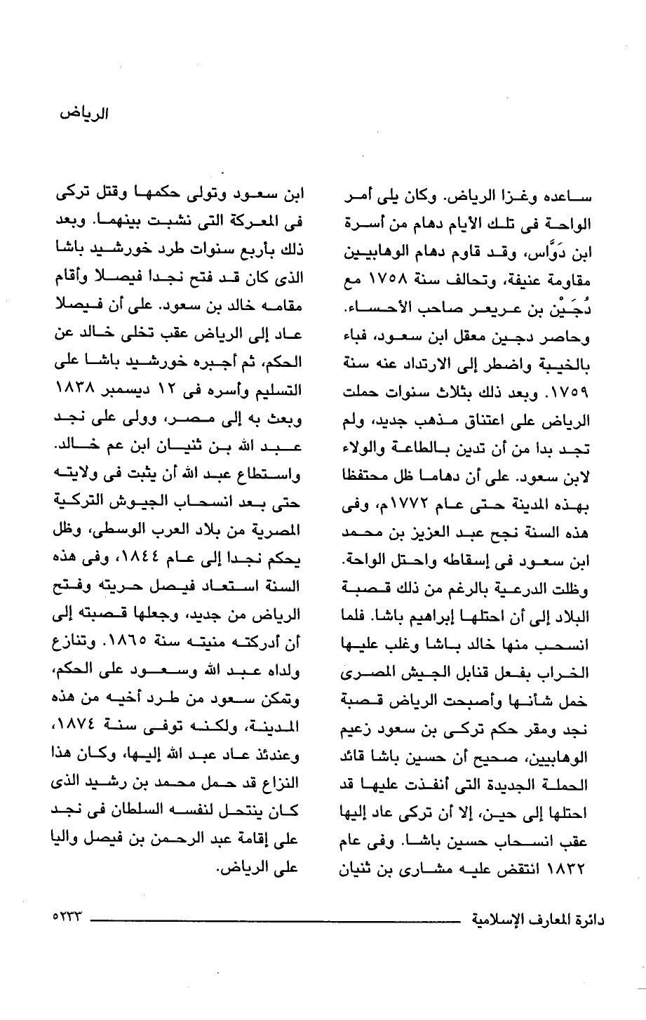 ساعده وغزا الرياض. وكان يلى أمر الواحة فى تلك الأيام دهام من أسرة ابن دَوَّاس، وقد قاوم دهام الوهابيين مقاومة عنيفة، وتحالف سنة 1758 مع دُجَيْن بن عريعر صاحب الأحساء. وحاصر دجين معقل ابن سعود، فباء بالخيبة واضطر إلى الارتداد عنه سنة 1759. وبعد ذلك بثلاث سنوات حملت الرياض على اعتناق مذهب جديد، ولم تجد بدا من أن تدين بالطاعة والولاء لابن سعود. على أن دهاما ظل محتفظا بهذه المدينة حتى عام 1772 م، وفى هذه السنة نجح عبد العزيز بن محمد ابن سعود فى إسقاطه واحتل الواحة. وظلت الدرعية بالرغم من ذلك قصبة البلاد إلى أن احتلها إبراهيم باشا. فلما انسحب منها خالد باشا وغلب عليها الخراب بفعل قنابل الجيش المصرى خمل شأنها وأصبحت الرياض قصبة نجد ومقر حكم تركى بن سعود زعيم الوهابيين، صحيح أن حسين باشا قائد الحملة الجديدة التى أنفذت عليها قد احتلها إلى حين، إلا أن تركى عاد إليها عقب انسحاب حسين باشا. وفى عام 1832 انتقض عليه مشارى بن ثنيان ابن سعود وتولى حكمها وقتل تركى فى المعركة التى نشبت بينهما. وبعد ذلك بأربع سنوات طرد خورشيد باشا الذى كان قد فتح نجدا فيصلا وأقام مقامه خالد بن سعود. على أن فيصلا عاد إلى الرياض عقب تخلى خالد عن الحكم، ثم أجبره خورشيد باشا على التسليم وأسره فى 12 ديسمبر 1838 وبعث به إلى مصر، وولى على نجد عبد اللَّه بن ثنيان ابن عم خالد. واستطاع عبد اللَّه أن يثبت فى ولايته حتى بعد انسحاب الجيوش التركية المصرية من بلاد العرب الوسطى، وظل يحكم نجدا إلى عام 1844, وفى هذه السنة استعاد فيصل حريته وفتح الرياض من جديد، وجعلها قصبته إلى أن أدركته منيته سنة 1865. وتنازع ولداه عبد اللَّه وسعود على الحكم، وتمكن سعود من طرد أخيه من هذه المدينة، ولكنه توفى سنة 1874, وعندئذ عاد عبد اللَّه إليها، وكان هذا النزاع قد حمل محمد بن رشيد الذى كان ينتحل لنفسه السلطان فى نجد على إقامة عبد الرحمن بن فيصل واليا على الرياض.