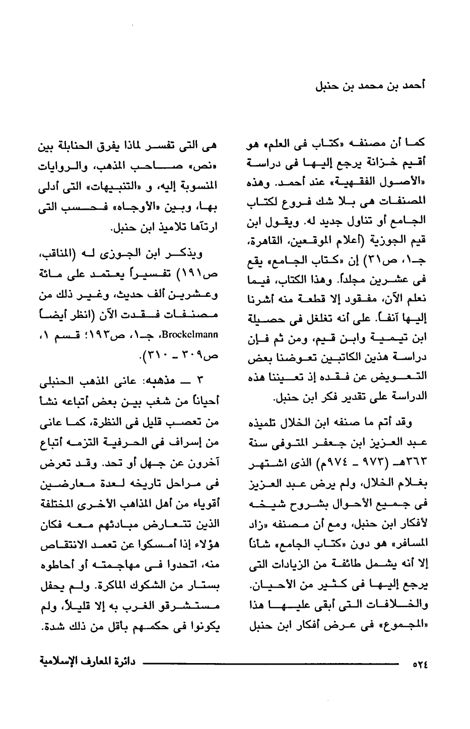 كما أن مصنفه "كتاب فى العلم" هو أقيم خزانة يرجع اليها فى دراسة "الأصول الفقهية" عند أحمد. وهذه ألمصنفات هى بلا شك فروع لكتاب الجامع أو تناول جديد له. ويقول ابن قيم الجوزية (أعلام الموقعين، القاهرة، ج 1، ص 31) إن "كتاب الجامع" يقع فى عشرين مجلدًا. وهذا الكتاب، فيما نعلم الآن، مفقود إلا قطعة منه أشرنا إليها آنفا. على أنه تغلغل فى حصيلة ابن تيمية وابن قيم، ومن ثم فإن دراسة هذين الكاتبين تعوضنا بعض التعويض عن فقده إذ تعيننا هذه الدراسة على تقدير فكر ابن حنبل.