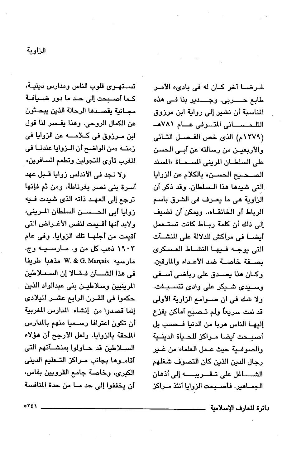 غرضا آخر كان له فى بادئ الأمر طابع حربى. وجدير بنا فى هذه المناسبة أن نشير إلى رواية ابن مرزوق التلمسانى المتوفى عام 781 هـ (1379 م) الذى خص الفصل الثانى والأربعين من رسالته عن أبى الحسن على السلطان المرينى المسماة "المسند الصحيح الحسن" بالكلام عن الزوايا التى شيدها هذا السلطان. وقد ذكر أن الزاوية هى ما يعرف فى الشرق باسم الرباط أو الخانقاه، ويمكن أن نضيف إلى ذلك أن كلمة رباط كانت تستعمل أيضا فى مراكش للدلالة على المنشآت التى يوجه فيها النشاط العسكرى بصفة خاصة ضد الأعداء والمارقين. وكان هذا يصدق على رباضى آسفى وسيدى شيكر على وادى تنسيفت. ولا شك فى أن صوامع الزاوية الأولى قد نمت سريعًا ولم تصبح أماكن يفزع إليها الناس هربا من الدنيا فحسب بل أصبحت أيضا مراكز للحياة الدينية والصوفية حيث عمل العلماء من غير رجال الدين الذين كان التصوف شغلهم الشاغل على تقريبه إلى أذهان الجماهير. فأصبحت الزوايا آنئذ مراكز تستهوى قلوب الناس ومدارس دينية، كما أصبحت إلى حد ما دور ضيافة مجانية يقصدها الرحالة الذين يبحثون عن الكمال الروحى. وهذا يفسر لنا قول ابن مرزوق فى كلامه عن الزوايا فى زمنه "من الواضح أن الزوايا عندنا فى المغرب تأوى المتجولين وتطعم المسافرين".