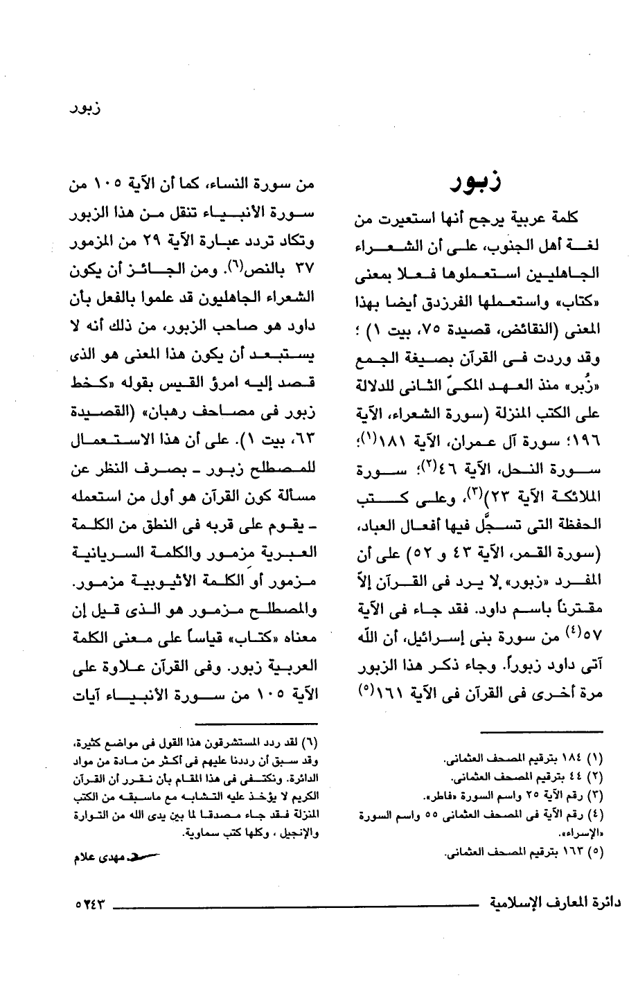 كلمة عربية يرجح أنها استعيرت من لغة أهل الجنوب، على أن الشعراء الجاهليين استعملوها فعلا بمعنى "كتاب" واستعملها الفرزدق أيضا بهذا المعنى (النقائض، قصيدة 75، بيت 1)؛ وقد وردت فى القرآن بصيغة الجمع "زُبر" منذ العهد المكىّ الثانى للدلالة على الكتب المنزلة (سورة الشعراء، الآية 196؛ سورة آل عمران، الآية 181 (¬1)؛ سورة النحل، الآية 46 (¬2)؛ سورة الملائكة الآية 23) (¬3)، وعلى كتب الحفظة التى تسجل فيها أفعال العباد، (سورة القمر، الآية 43 و 52) على أن المفرد "زبور" لا يرد فى القرآن إلَّا مقترنا باسم داود. فقد جاء فى الآية 57 (¬4) من سورة بنى إسرائيل، أن اللَّه آتى داود زبورًا. وجاء ذكر هذا الزبور مرة أخرى فى القرآن فى الآية 161 (¬5) من سورة النساء، كما أن الآية 105 من سورة الأنبياء تنقل من هذا الزبور وتكاد تردد عبارة الآية 79 من المزمور 37 بالنص (¬6). ومن الجائز أن يكون الشعراء الجاهليون قد علموا بالفعل بأن داود هو صاحب الزبور، من ذلك أنه لا يستبعد أن يكون هذا المعنى هو الذى قصد إليه امرؤ القيس بقوله "كخط زبور فى مصاحف رهبان" (القصيدة 63، بيت 1). على أن هذا الاستعمال للمصطلح زبور -بصرف النظر عن مسألة كون القرآن هو أول من استعمله- يقوم على قربه فى النطق من الكلمة العبرية مزمور والكلمة السريانية مزمور أو الكلمة الأثيوبية مزمور. والمصطلح مزمور هو الذى قيل إن معناه "كتاب" قياسًا على معنى الكلمة العربية زبور. وفى القرآن علاوة على الآية 105 من سورة الأنبياء آيات